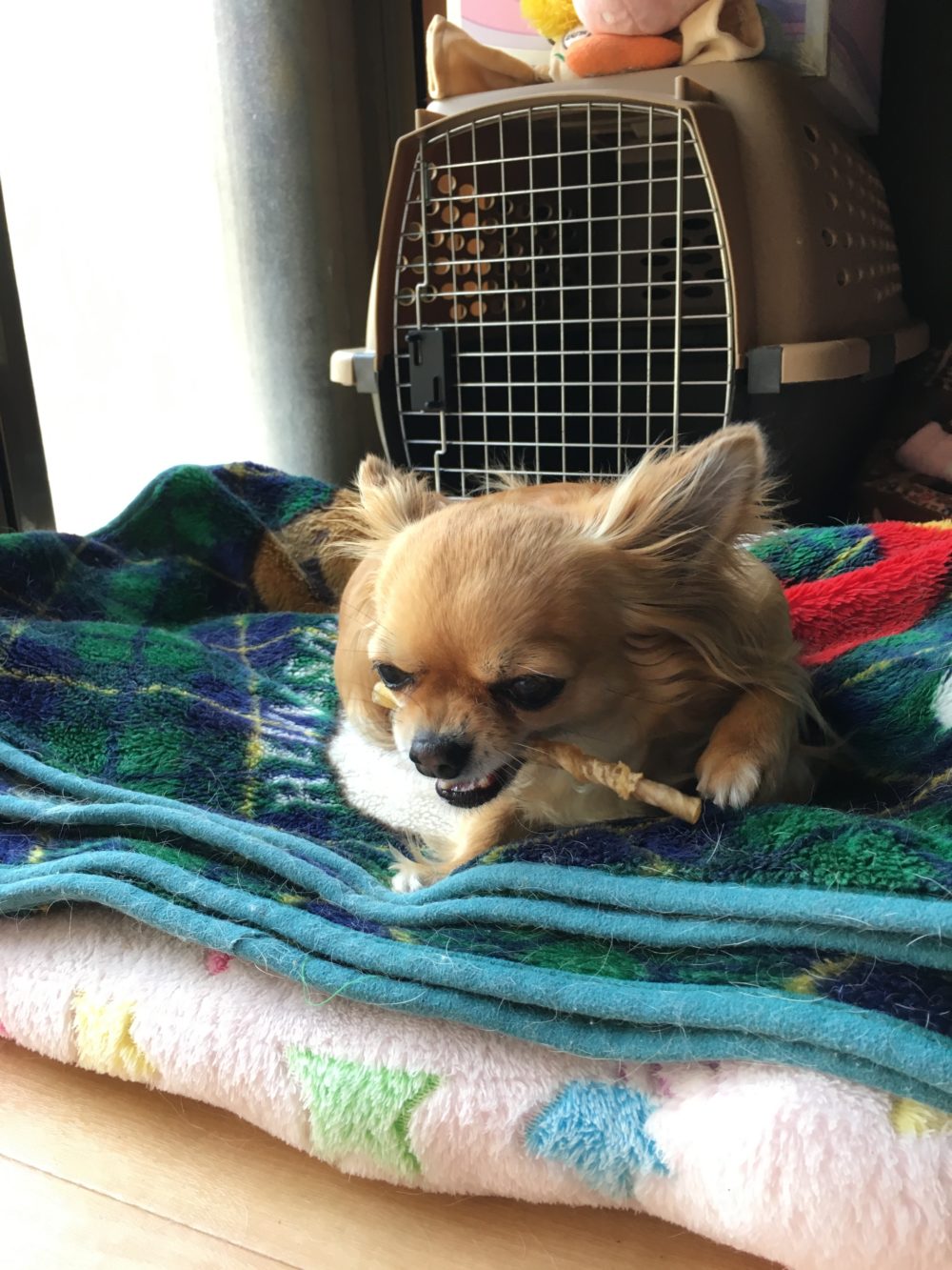 どんぐりちゃんはライトくんを長らく抱っこしている間も全く怒らず、おやつのガムをハムハムしていました。