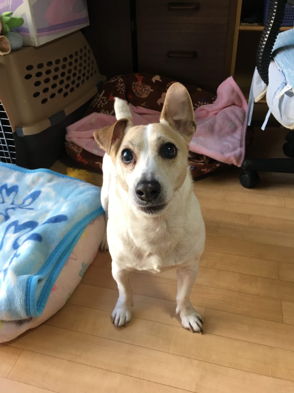 まず、ご紹介。ライトくん、ジャックラッセルテリア 10才の男の子です。ライトくんは目が見えませんが、お部屋の中の位置をちゃんと把握していて日常生活にほとんど不自由ありません。