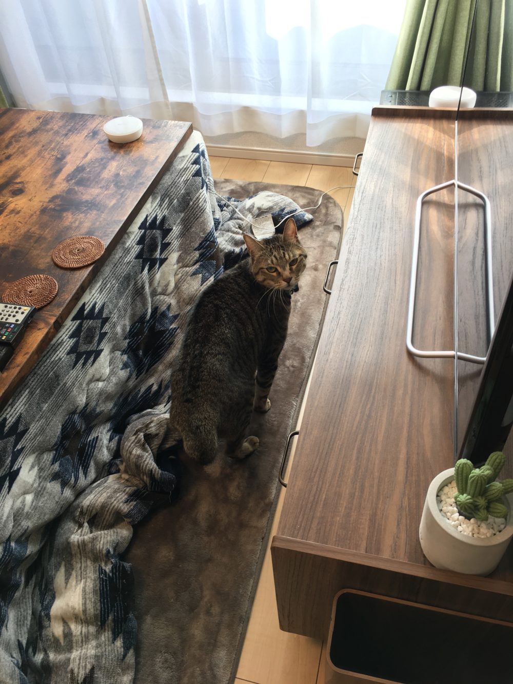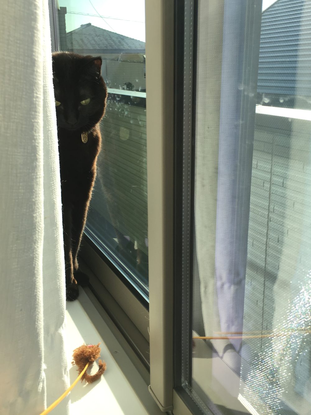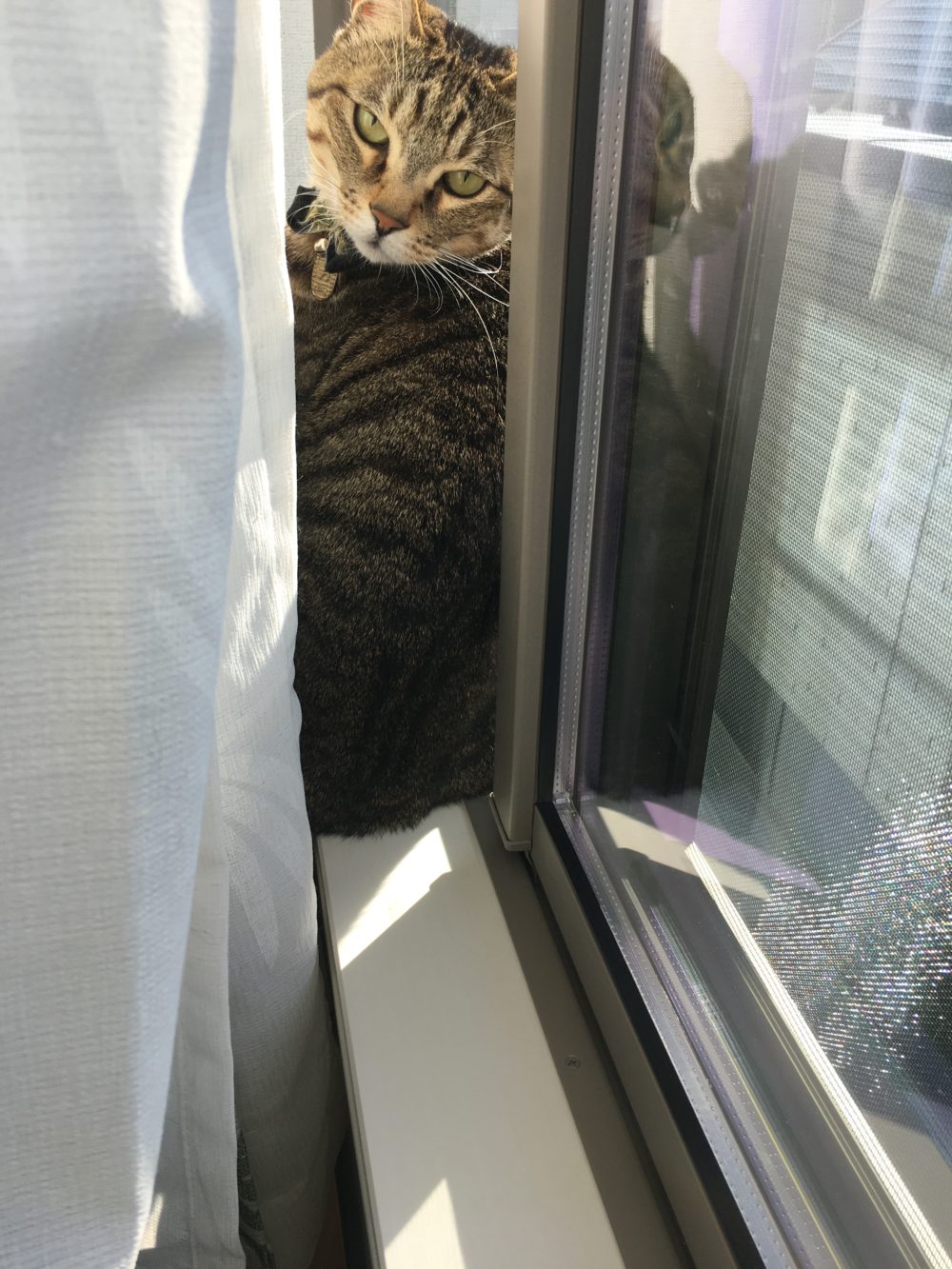 渚ちゃんは食べ終わり、カーテンの向こう側で日向ぼっこ。
