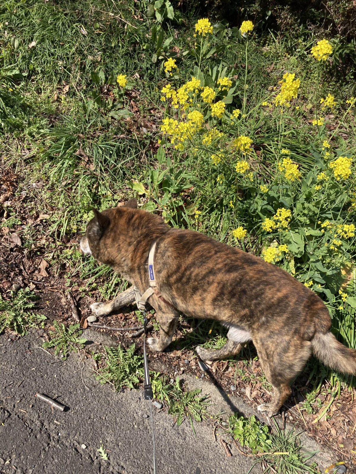 菜の花が咲く川沿いの道をゆっくりゆっくり歩き、気をつけながらお散歩🐕