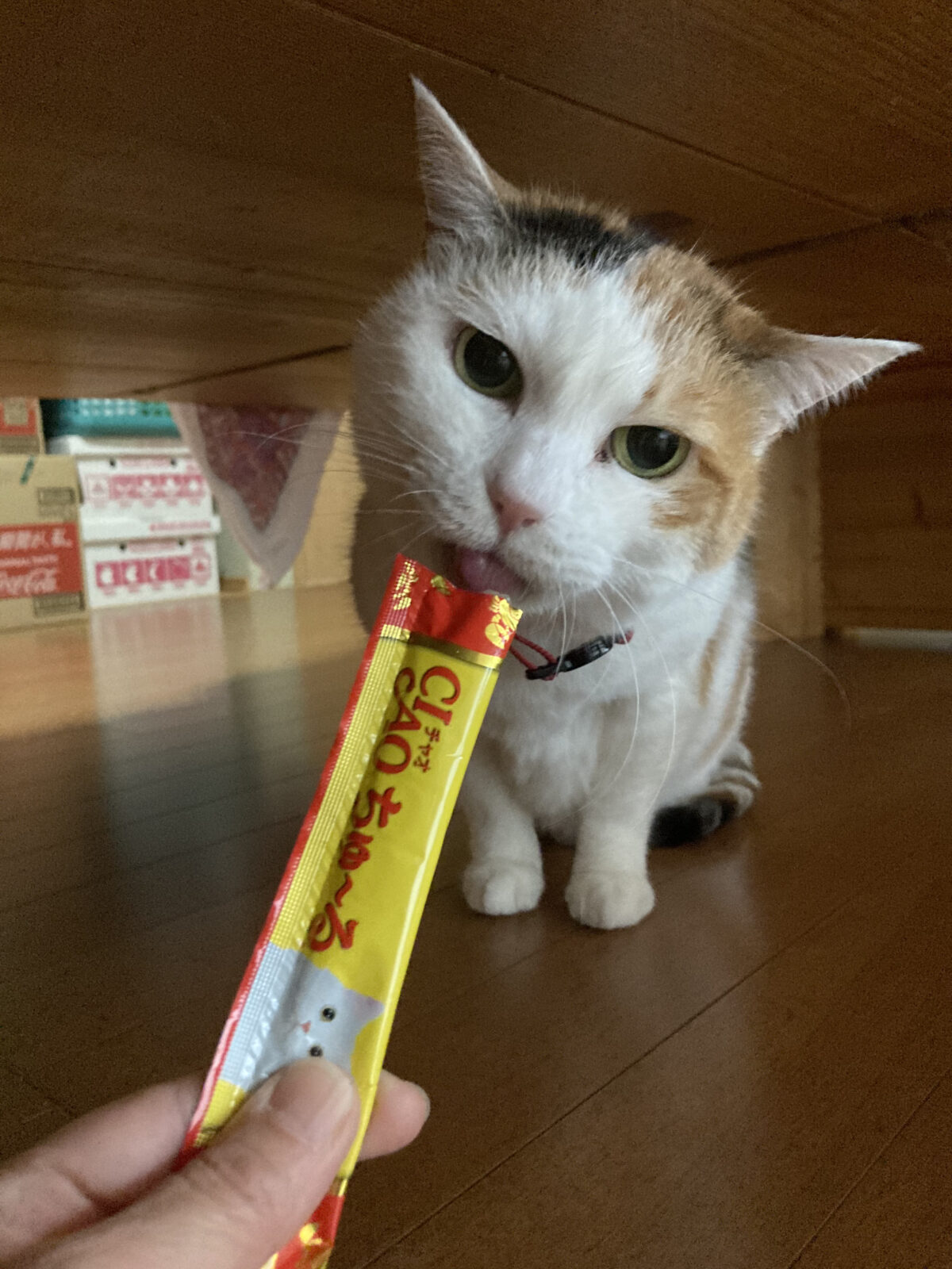 おやつのチュールをあげる時、最初は近づくと後ずさりしていたのが距離が近くても大丈夫になっていきました😊