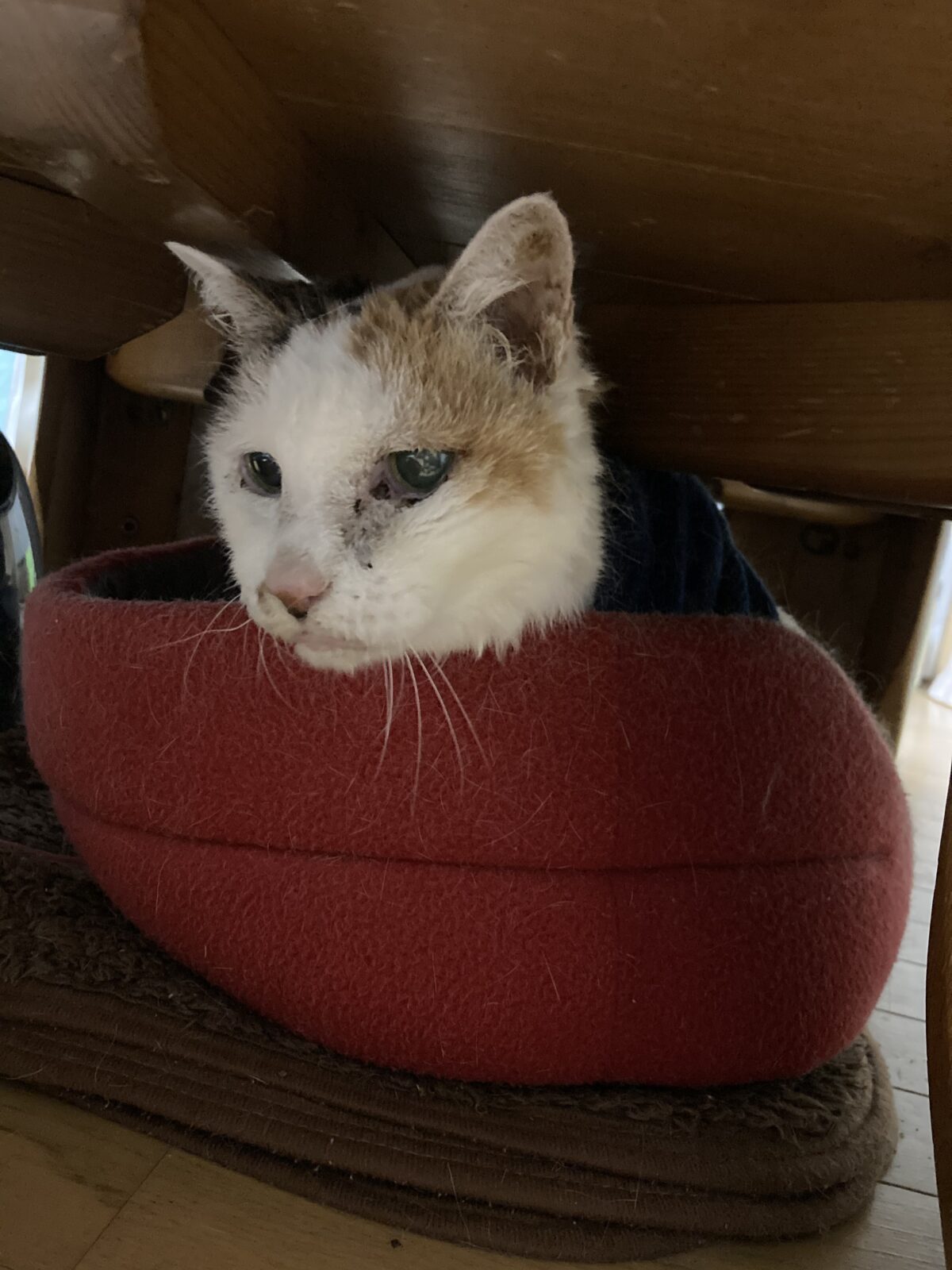 ちょっぴり人見知りさんで、シッターがいる間はネコハウスかテーブルの下のどちらかにいました。