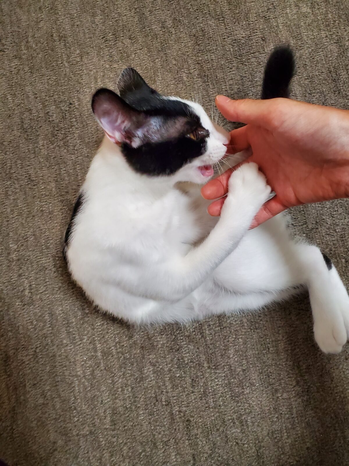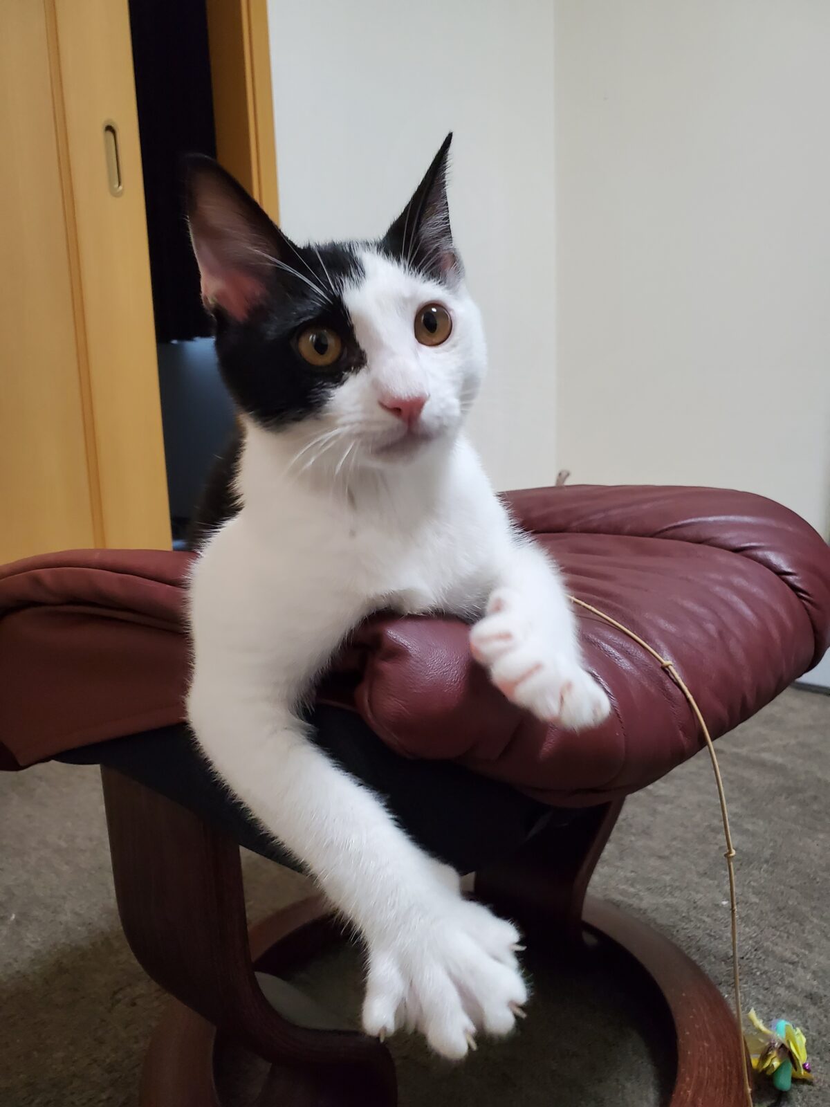 元野良猫でまだまだ子猫のもちくん。あっちにこっちに飛び回って遊びも激しいです^^遊びながらのどゴロゴロさせてくれるのホント可愛い