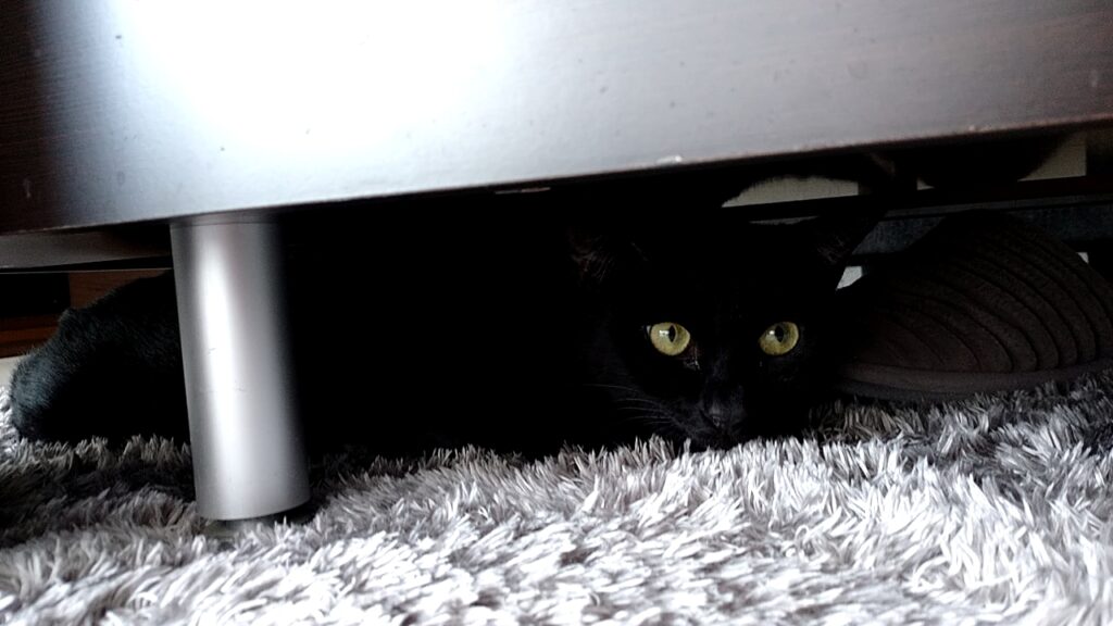 キキちゃんは今まで何処にいるか探さないといけなかったですか、ローテーブルの下で様子見てます☺️
