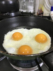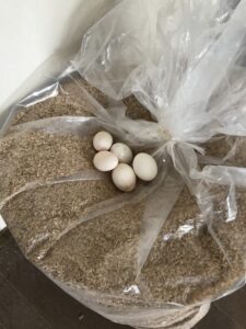 飼い主様が旅行に行かれてから4日後にペットシッターに来るように依頼がありましたのでお約束の日にお伺いしたところ5個産んでました。置いてても仕方がないので持って帰って料理に使って欲しいとのこと。ありがたく頂戴し目玉焼きにしていただきました。黄身がプリップリで美味しかったです。