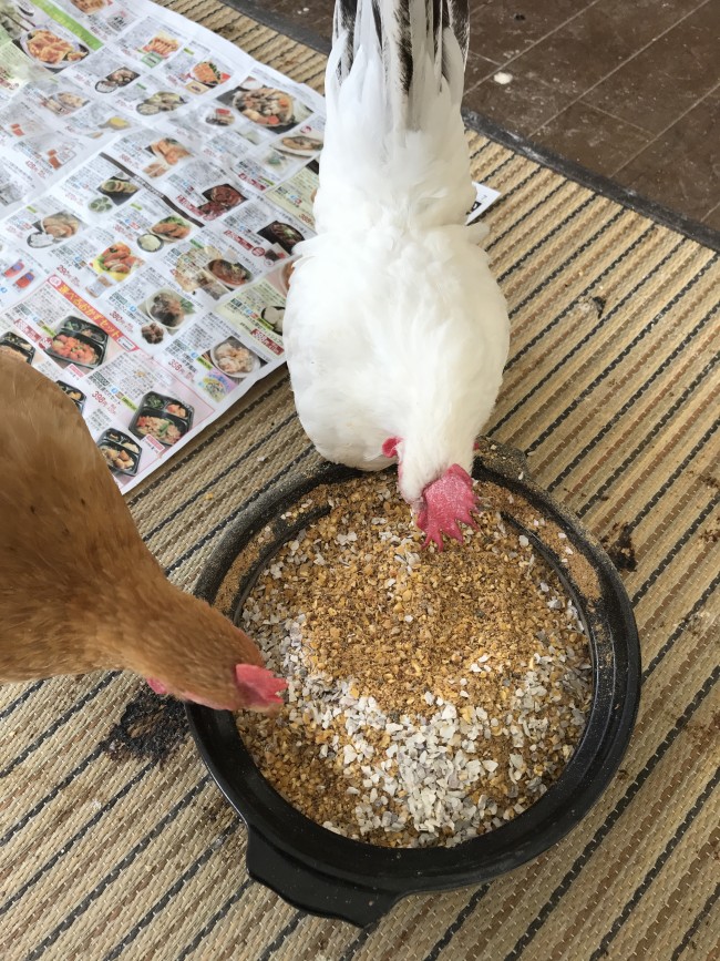 かすみちゃんとこがねちゃんは1歳4か月。立派な成鶏なので卵を産みます。