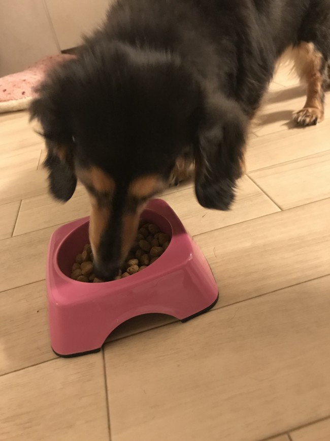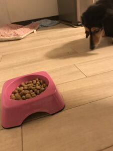 でも、ご飯の用意をして床に置くと、鋭い嗅覚でトコトコ歩いてきます。
