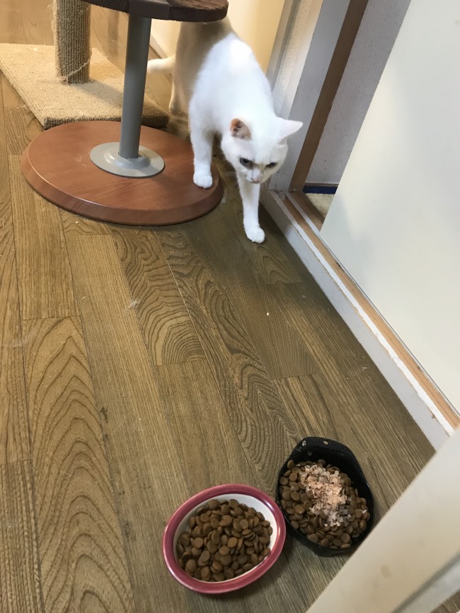 シッターがいる間にユキちゃんはご飯を食べに来てはくれませんでしたが、ミミくんはご飯が出てくるのを待ってます😺