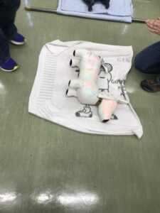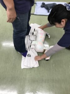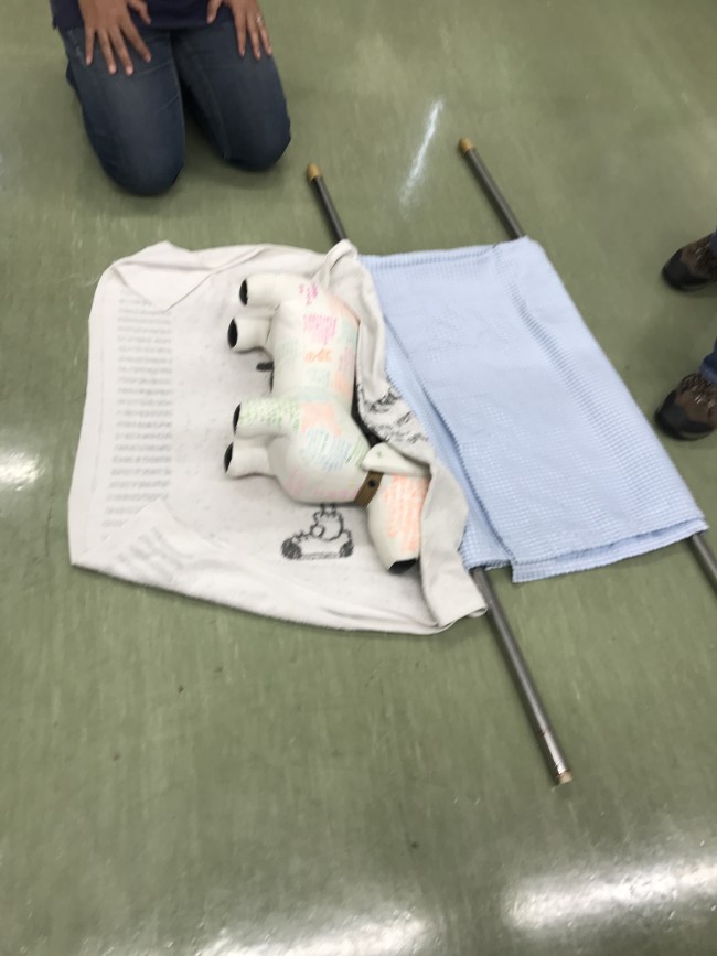 ぬいぐるみを使って、意識のない大型犬を設定しての担架の乗せ方の練習。