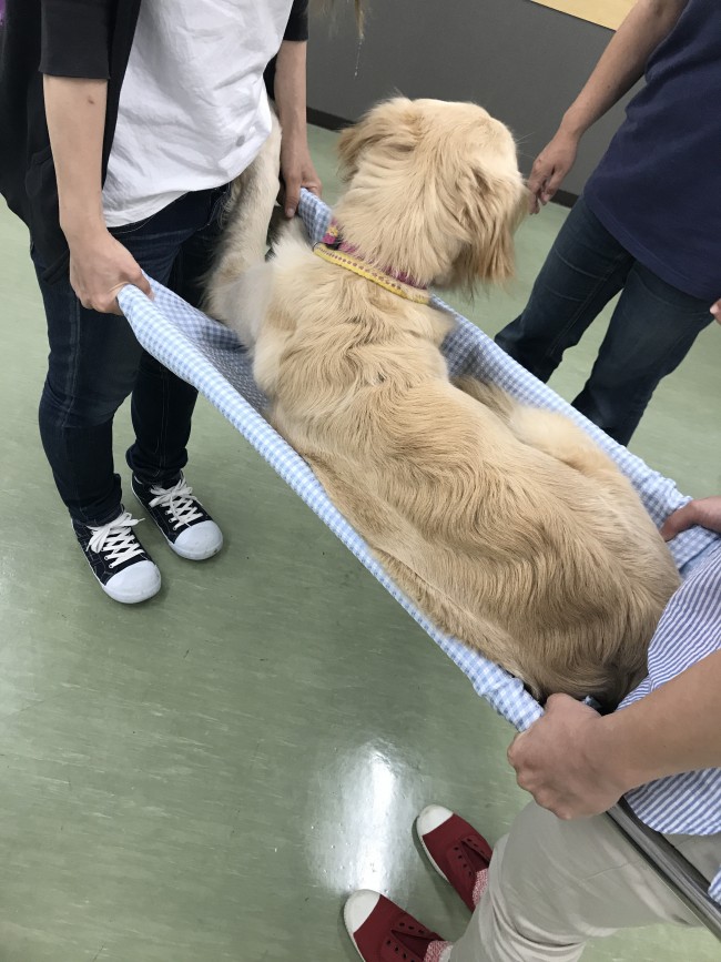 めちゃくちゃ賢い!担架に乗せる練習、普通の犬なら絶対飛び降りるのにリアン先生余裕です。