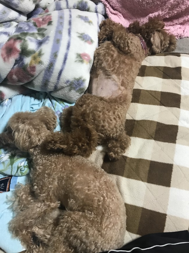 上の写真を見たら嘘みたいな話ですね。すっかりうちのわんこと仲良くなって一緒に寝てます。しかもうちのわんこ蹴られてる(笑)