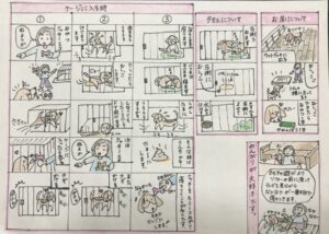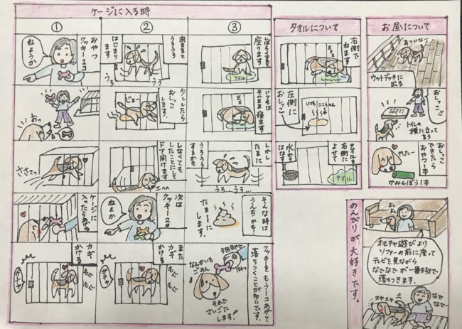 シッターにお伺いした時にテーブルにこうして下さいとメモが置かれている事はよくあります。でも、今回マンガのように分かりやすく書いていただいたのは初めてでした。もちろん打合せをしていますので、重複している内容もありますが、つくねちゃんがとっても大事にされている事がよく分かります。私は絵心が全くないのでマンガが書けるだけで羨ましい(笑)