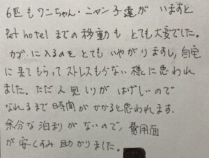 杏樹ちゃん、宙くん、花梨ちゃん、ミルクちゃん、小太郎くん、Paruちゃんのご家族様からアンケートのハガキが届きました。