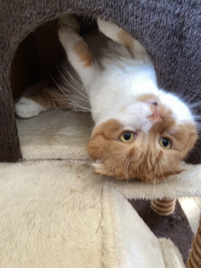 ペットホテルでスコティッシュフォールドのこまくんをお預かりしました。リピーターの猫ちゃんです😻何度もご利用いただいておりますので、すっかり慣れたものです 🙂キャットタワーの中が大好きなこまくんです。ちゅーるも美味しいね 🙂こまくんまたお泊りに来て下さいね。