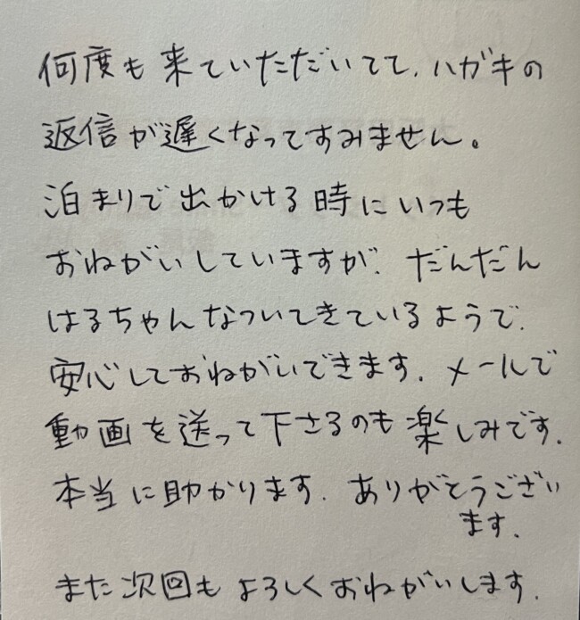 はるちゃんのご家族様からアンケートのハガキが届きました。ありがとうございます。今後ともよろしくお願い致します。