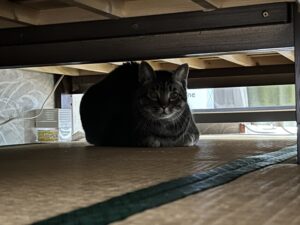 通良くんは怖がりさん。毎回ベッドの下に隠れています。でもね、ちょっとずつ距離は縮んでおやつの気配で廊下まで来てくれるようになりました 🙂