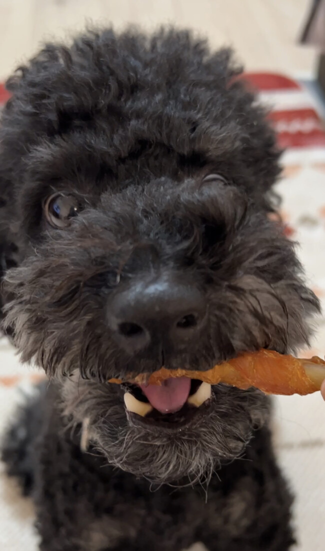 おやつをくわえてとても良い笑顔 🙂