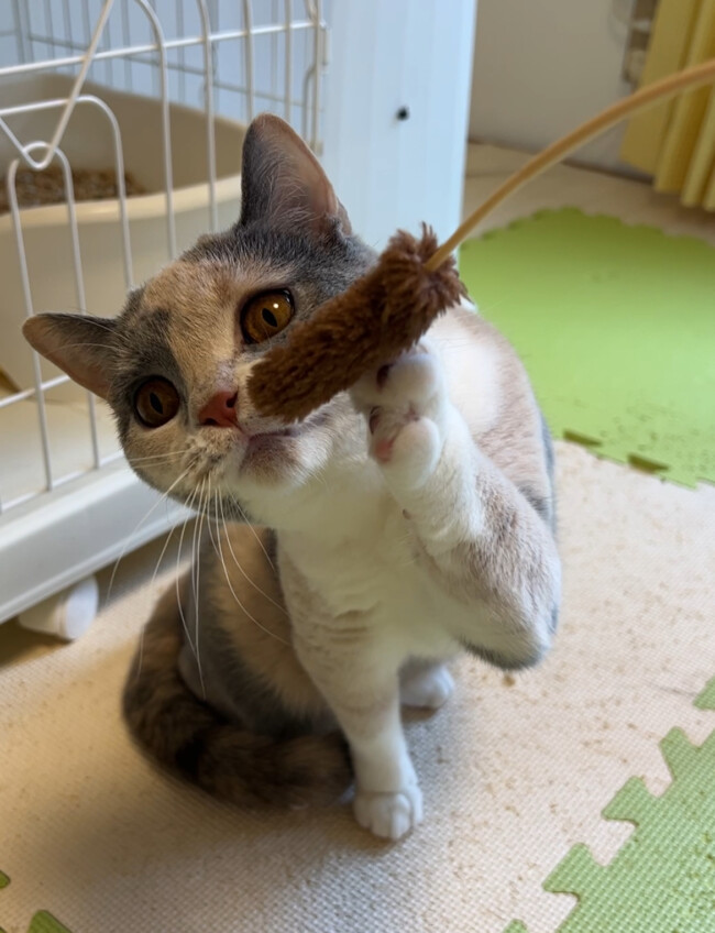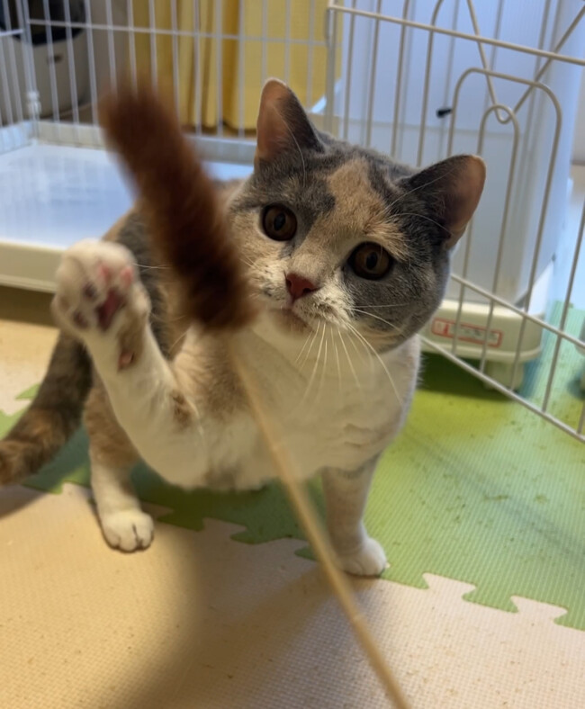 ミルクちゃん、ケージから出るのはちょっと怖いけど猫じゃらしで遊びます(笑)
