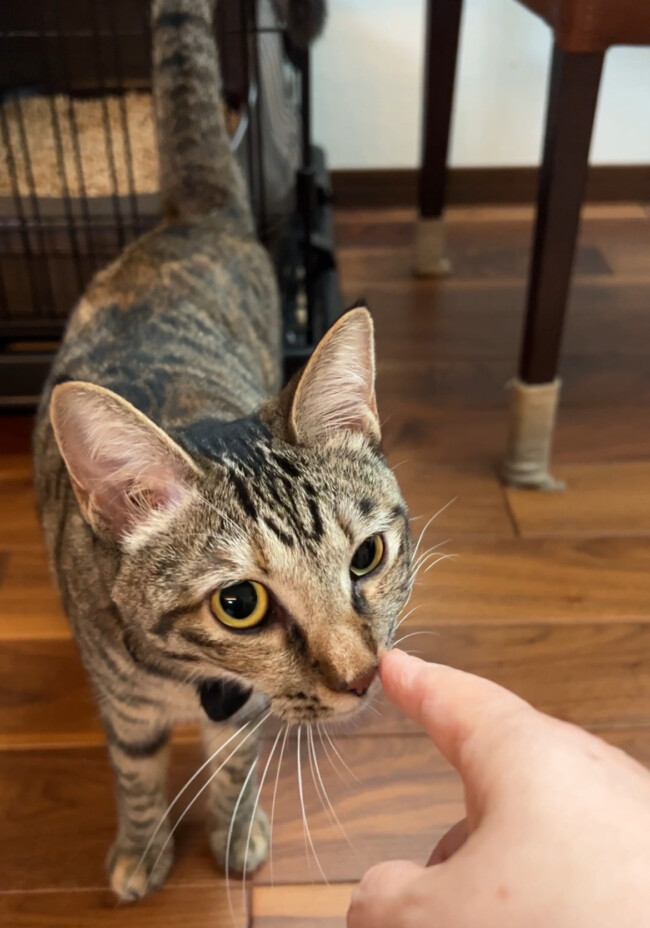 今回のお世話は箕面市にお住いのキジ猫のみやこちゃんです初めましての猫ちゃんです😻みやこちゃんはちょっとだけ人見知りの1歳の女の子😸打合せの時は少し怖がってケージの中にいましたが、お世話当日はご挨拶もちゃんと出来てどんどん慣れてくれました💕ちゅーるも大好きです 🙂遊ぶことも大好き💕ゴロゴロスリスリ~😻とっても可愛いみやこちゃんにまた会える日を楽しみにしております💕