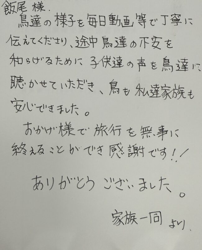 セキセイインコのまめくんとコガネメキシコインコのかぼちゃんのご家族様からアンケートのハガキが届きましたありがとうございます今後ともよろしくお願いいたします