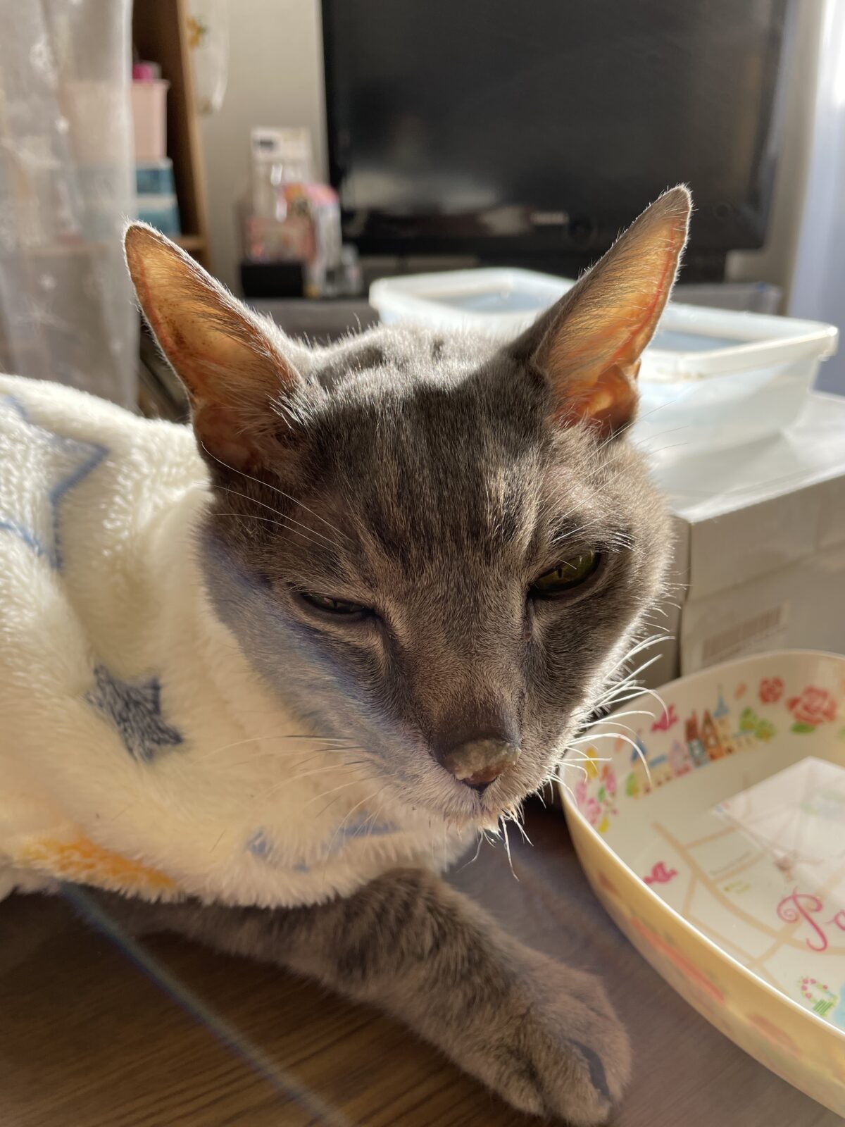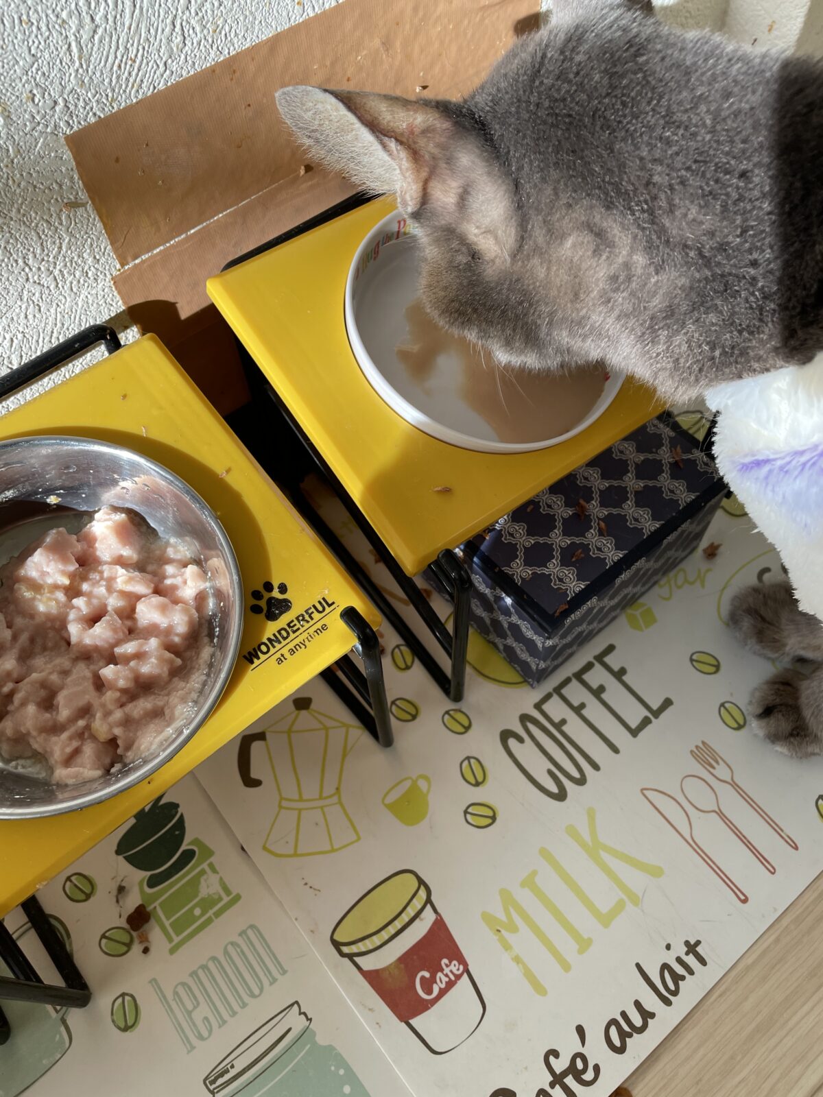 ご飯はカリカリより柔らかいものを好むと言うことなので、ペースト状の缶詰をあげたら、ペロペロと舐め始めました。飼い主様は普段からいろんなご飯を試されているご様子がわかり、とても優しい飼い主様だなあと、ちびちゃんはとても幸せですね。