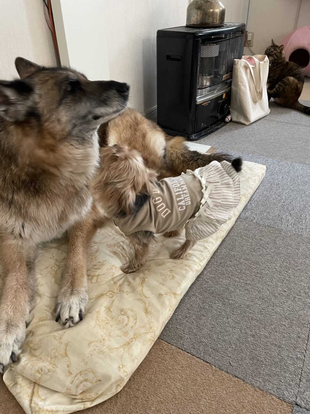 とても大きなシェパードたまちゃんは、実はとても優しいワンちゃんです。そして心ちゃんは、とっても元気な子です。こちらの家には猫ちゃんも2匹いて、総勢4匹でお留守番をしていました。