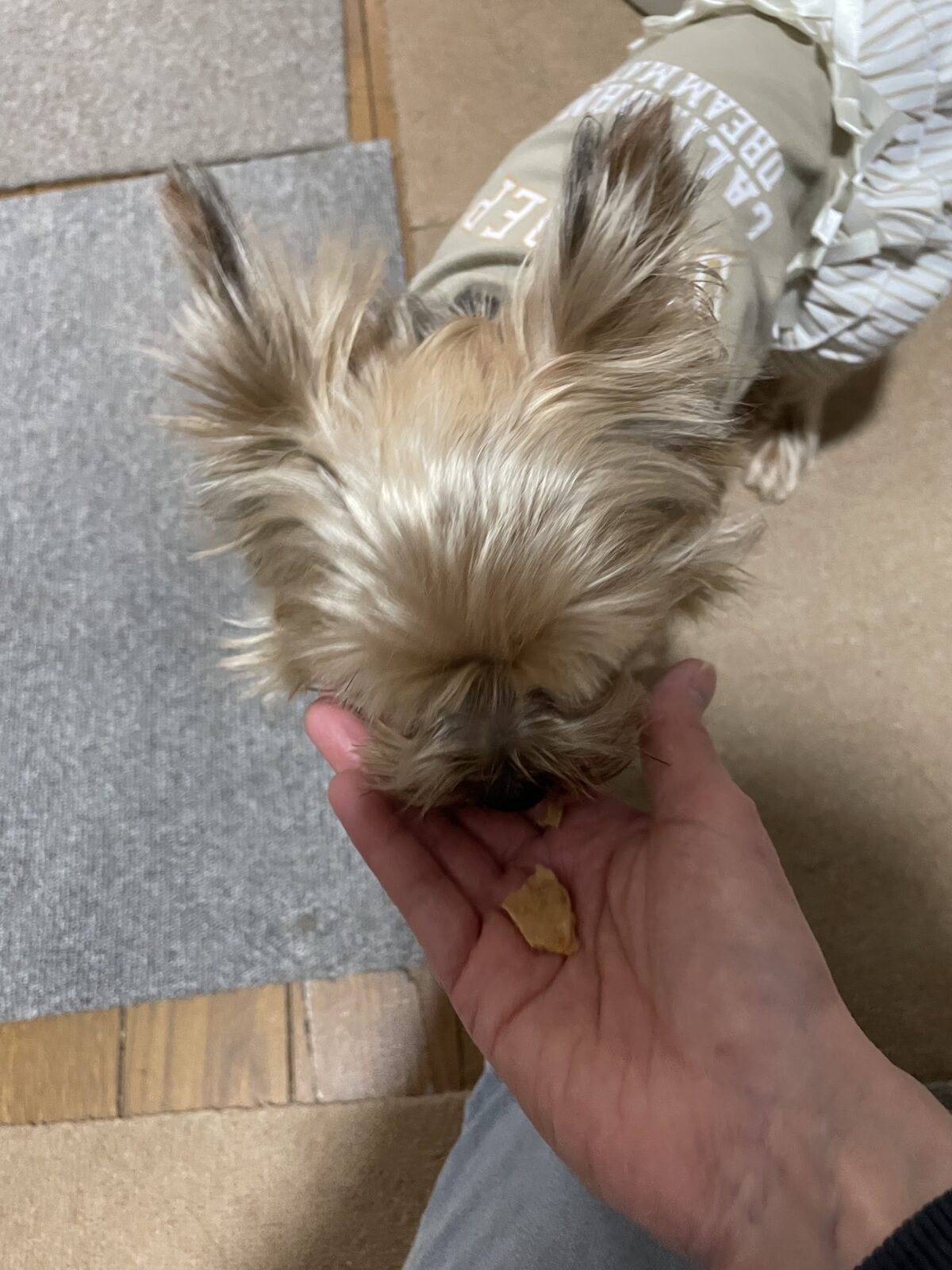 たまちゃんのご飯はたっぷりありましたが、大きなお口であっという間に食べてしまいました。足りなそうなので少しだけおやつを追加します。心ちゃんにもお裾分け。