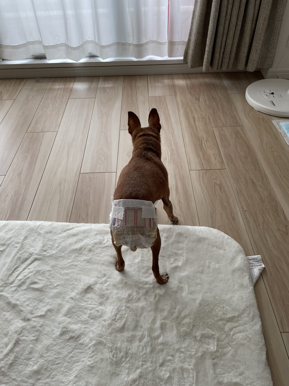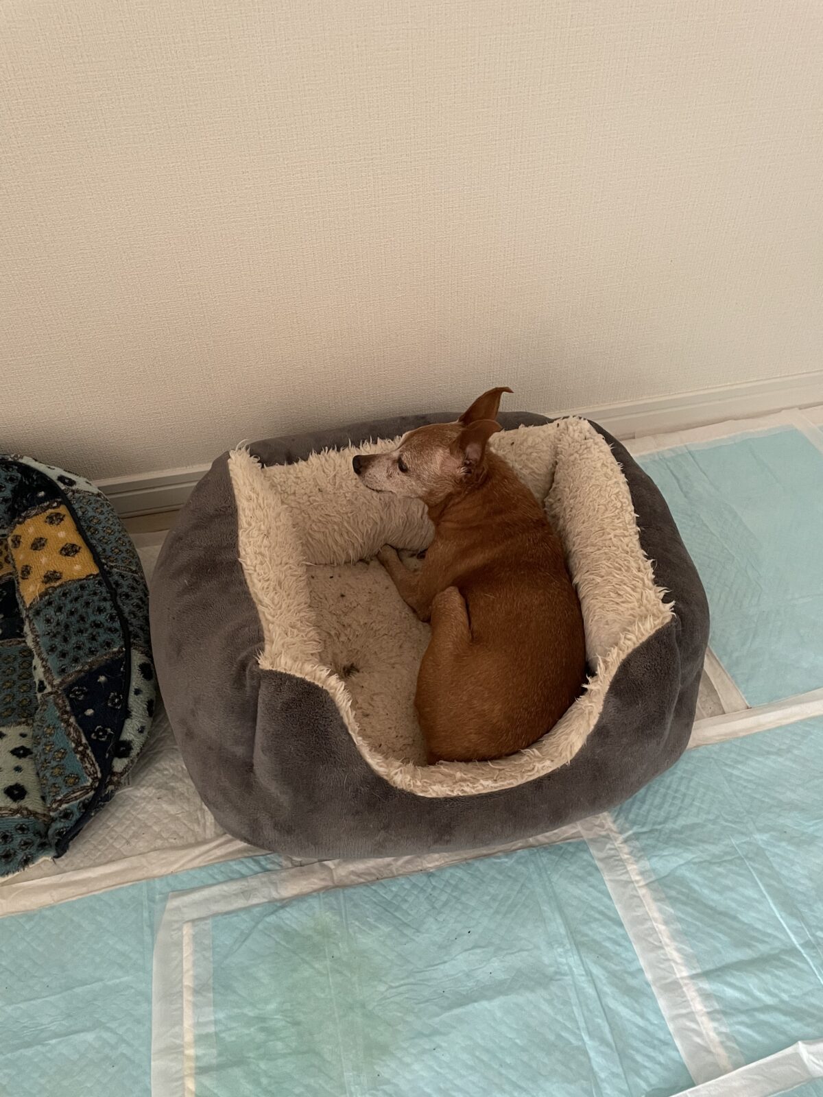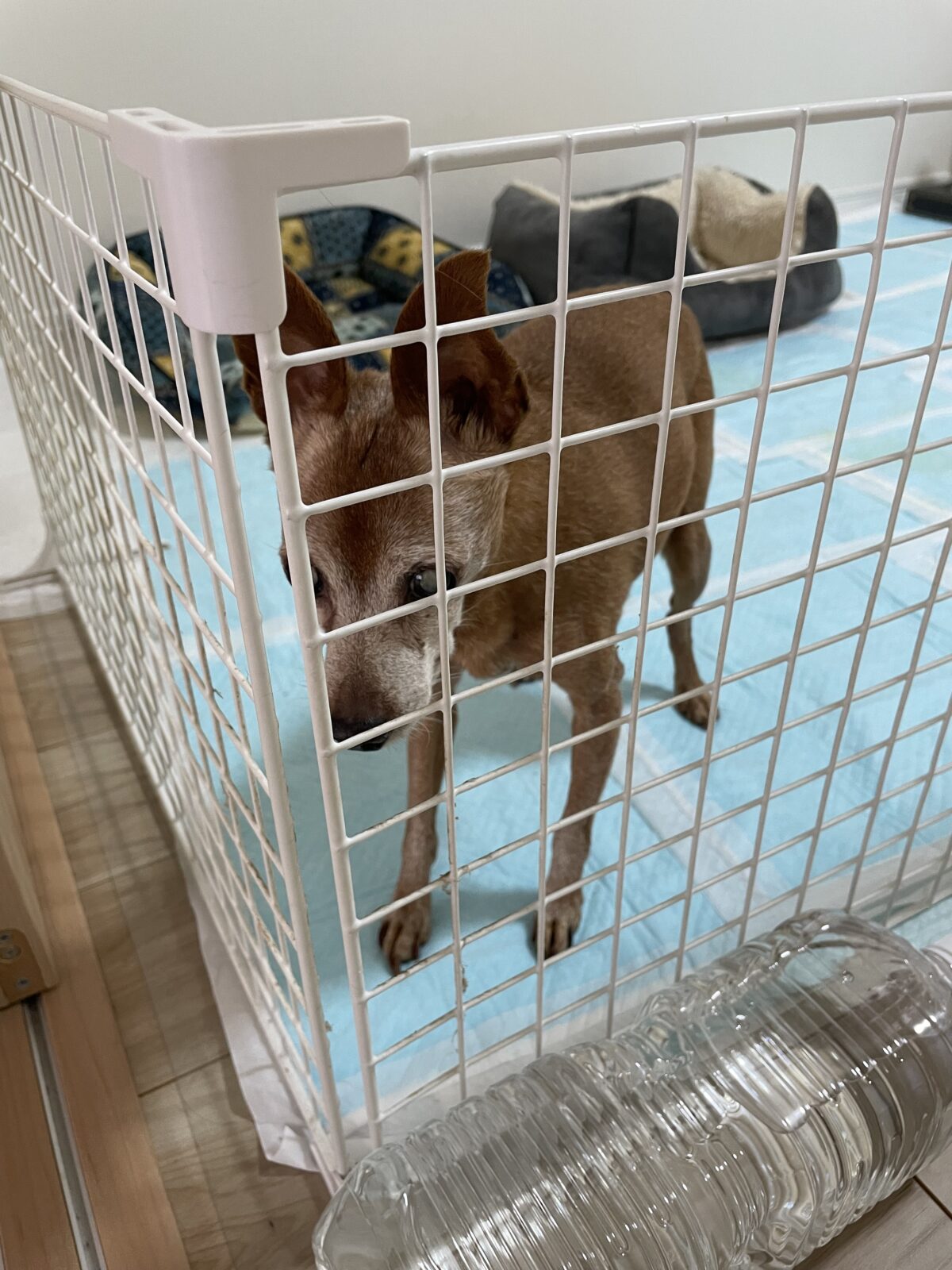 チャチャちゃんは16歳、白内障で耳も聞こえないそうですが、まだまだ元気です。おトイレはオムツを着けて、サークルを出て少し歩いてからオムツにしてくれるそう。歩くと腸の活動も良くなるのかな。