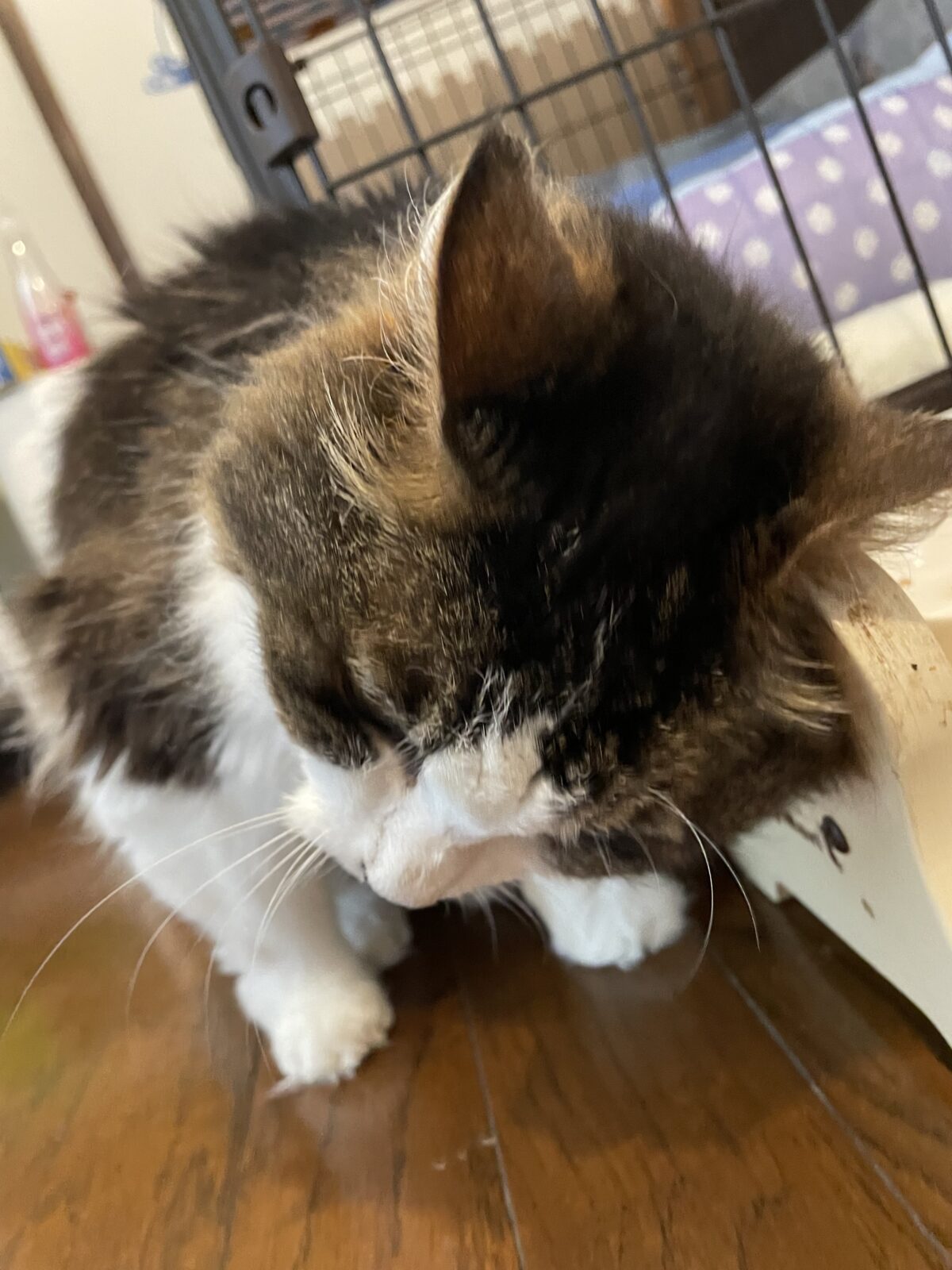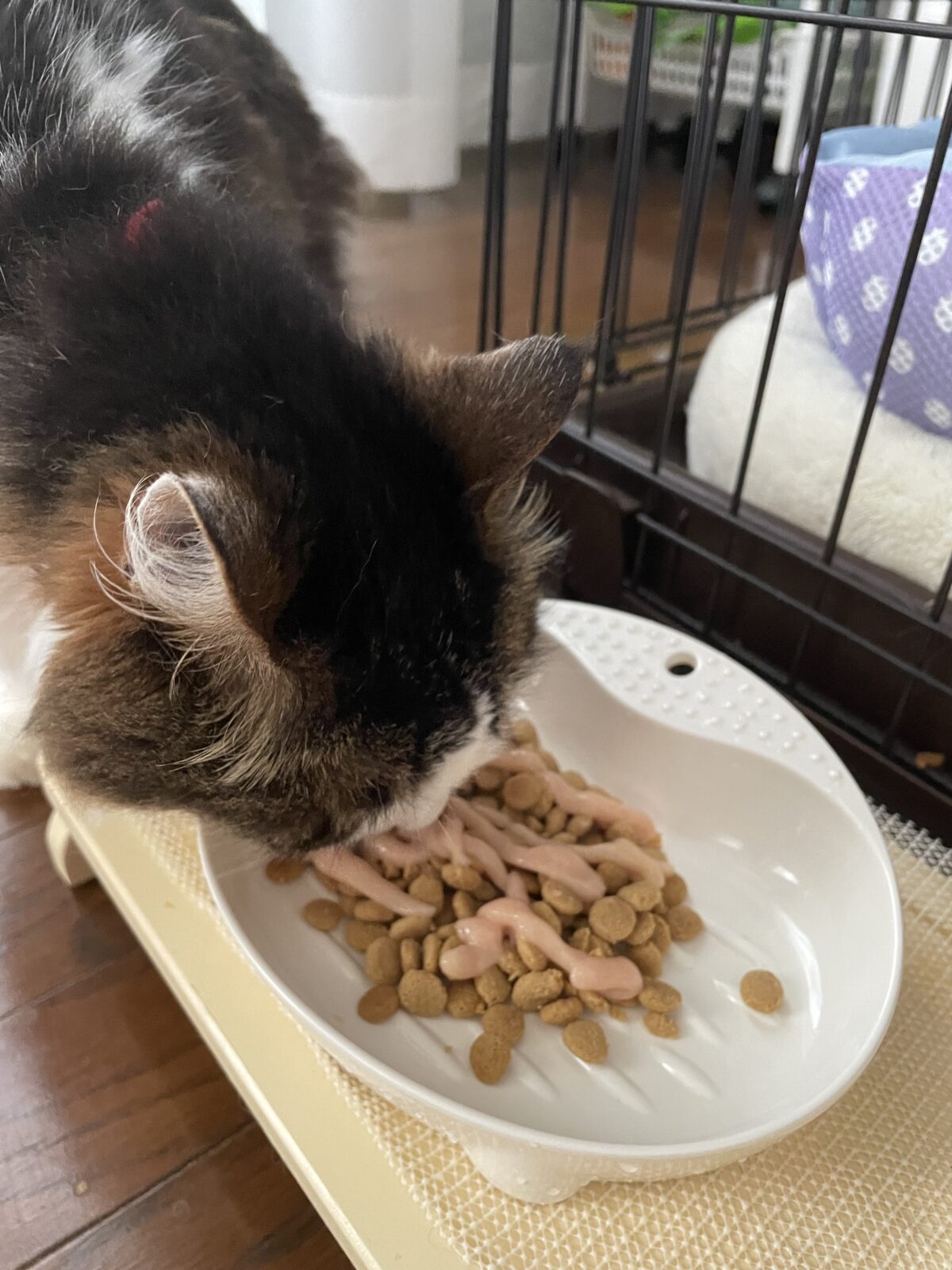 食欲がとてもあり、慌てて食べないために食前にチュールなどを食べます。すると落ち着いてご飯を食べてくれるんです。飼い主様の優しさ溢れるアイデアです。