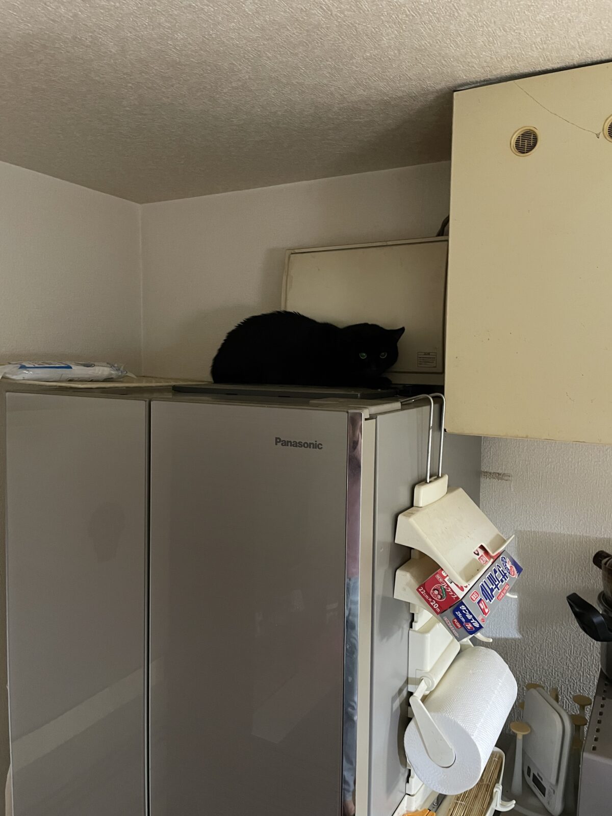 翌朝はなんと冷蔵庫の上にいました。おー、ジャンプしたんだ、すごいね、虚空くん。