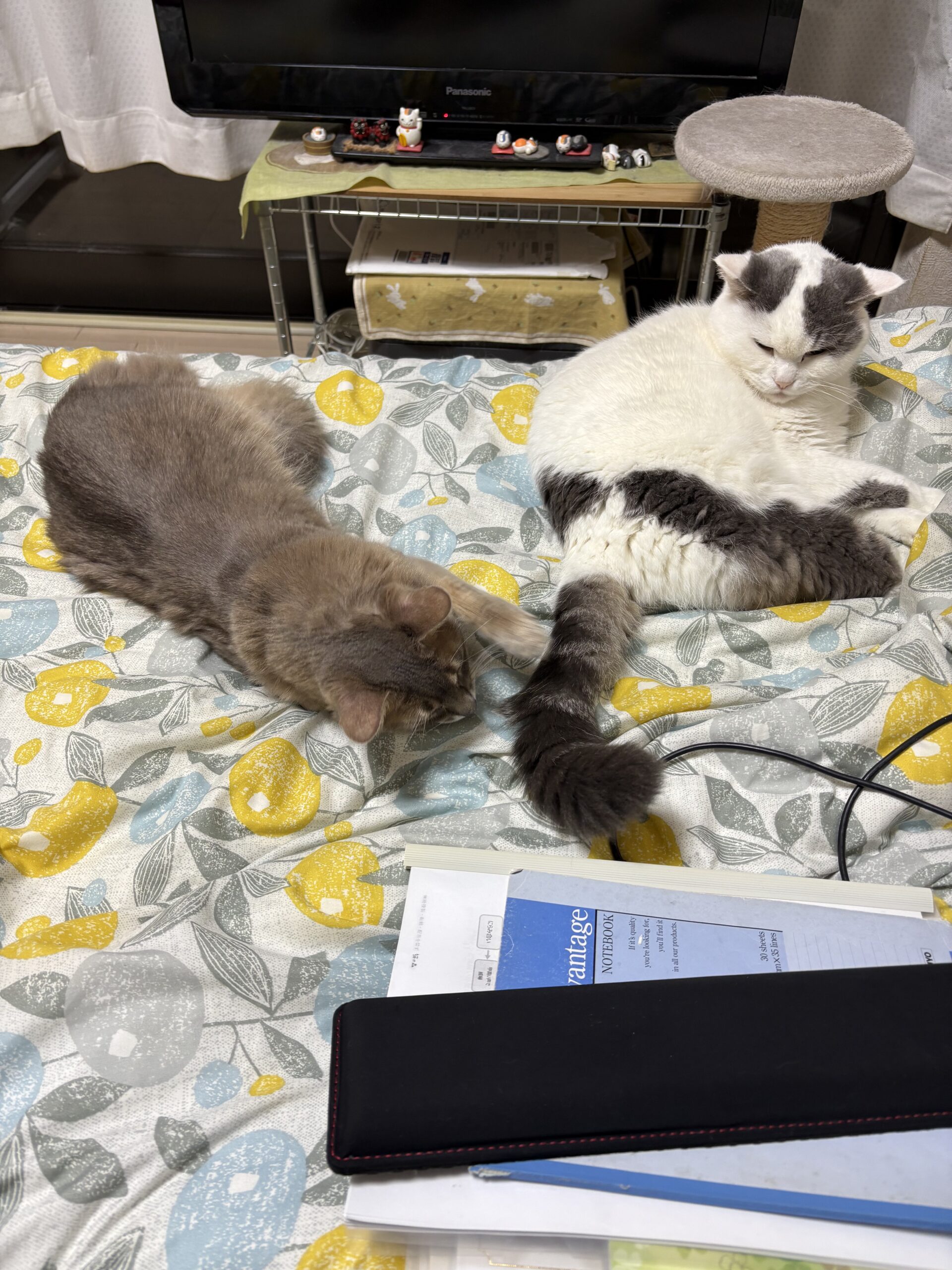 元保護猫の白黒つきちゃんと白キジツナちゃん。
