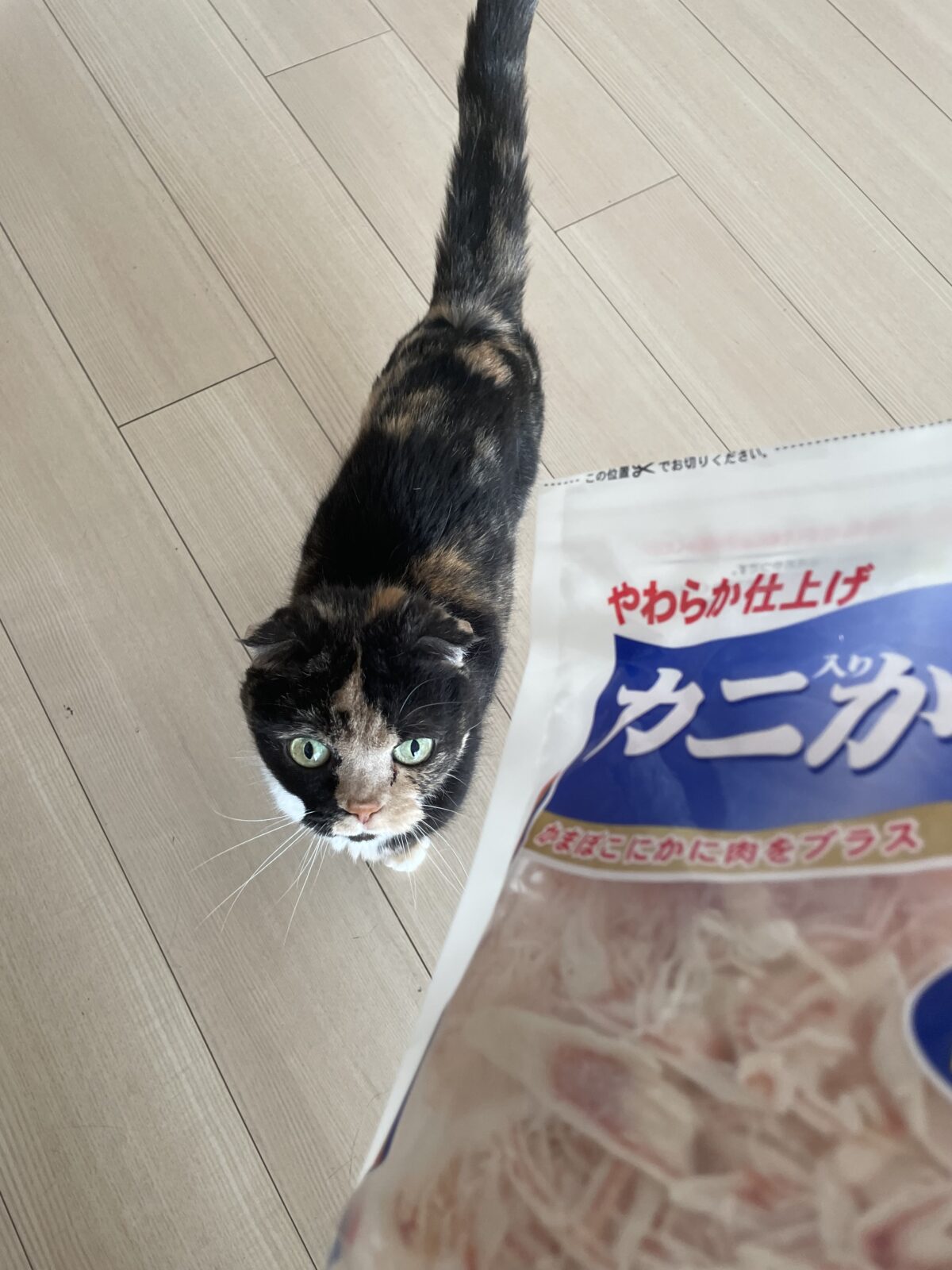 カニカマを見せると、足取りも軽く、トコトコ歩いていつも定位置で食べます。