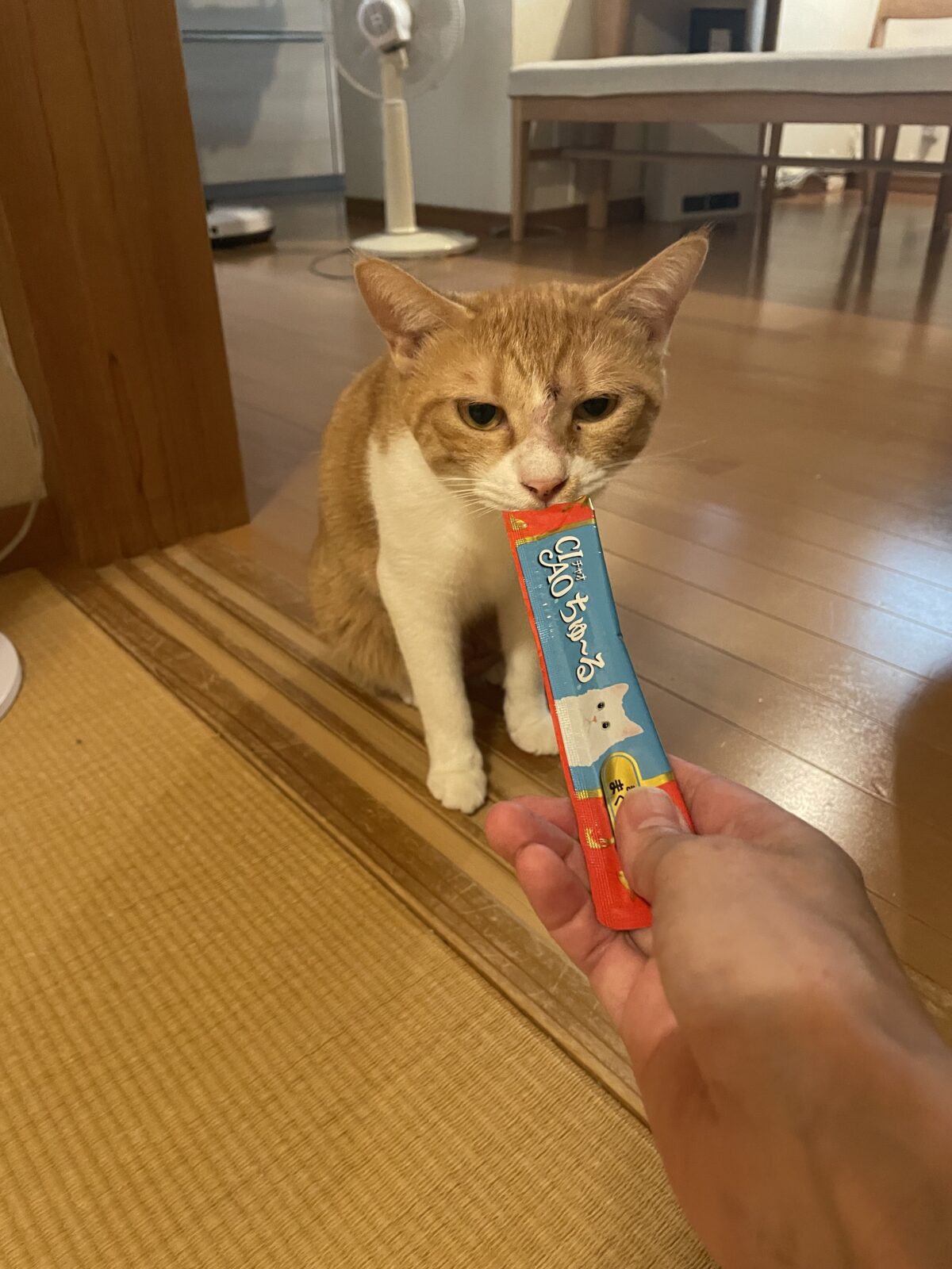 今回おやつ用のお皿がなかったことで、ならばと思いチュールを手からあげてみたら、わー、食べたっ!