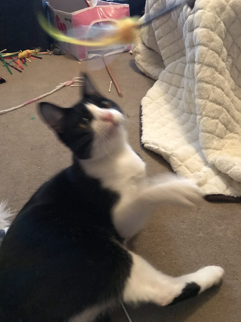 心なしか猫ちゃん炬燵で休むモラン君を気にしながら遊ぶ様子も見られました。