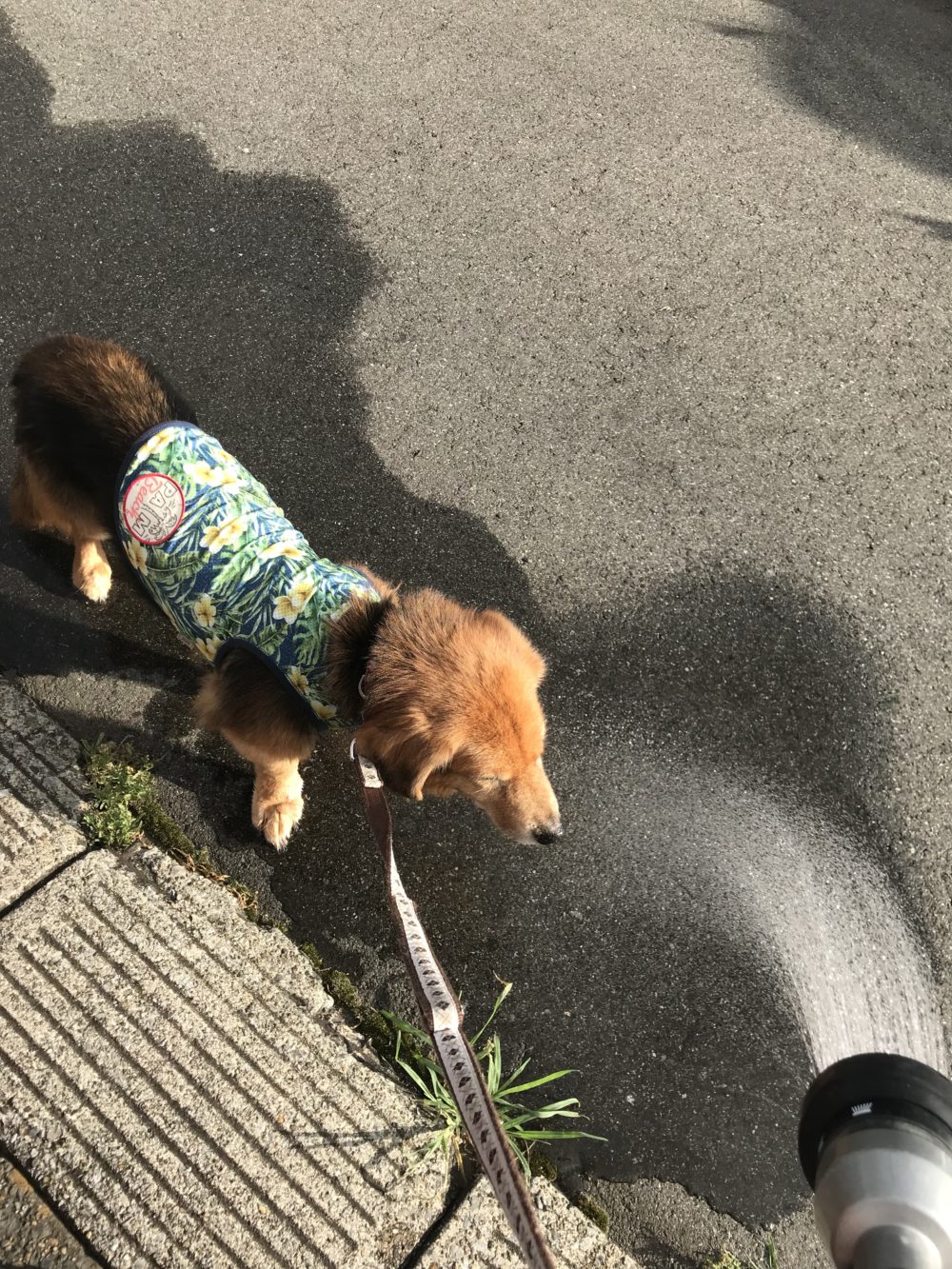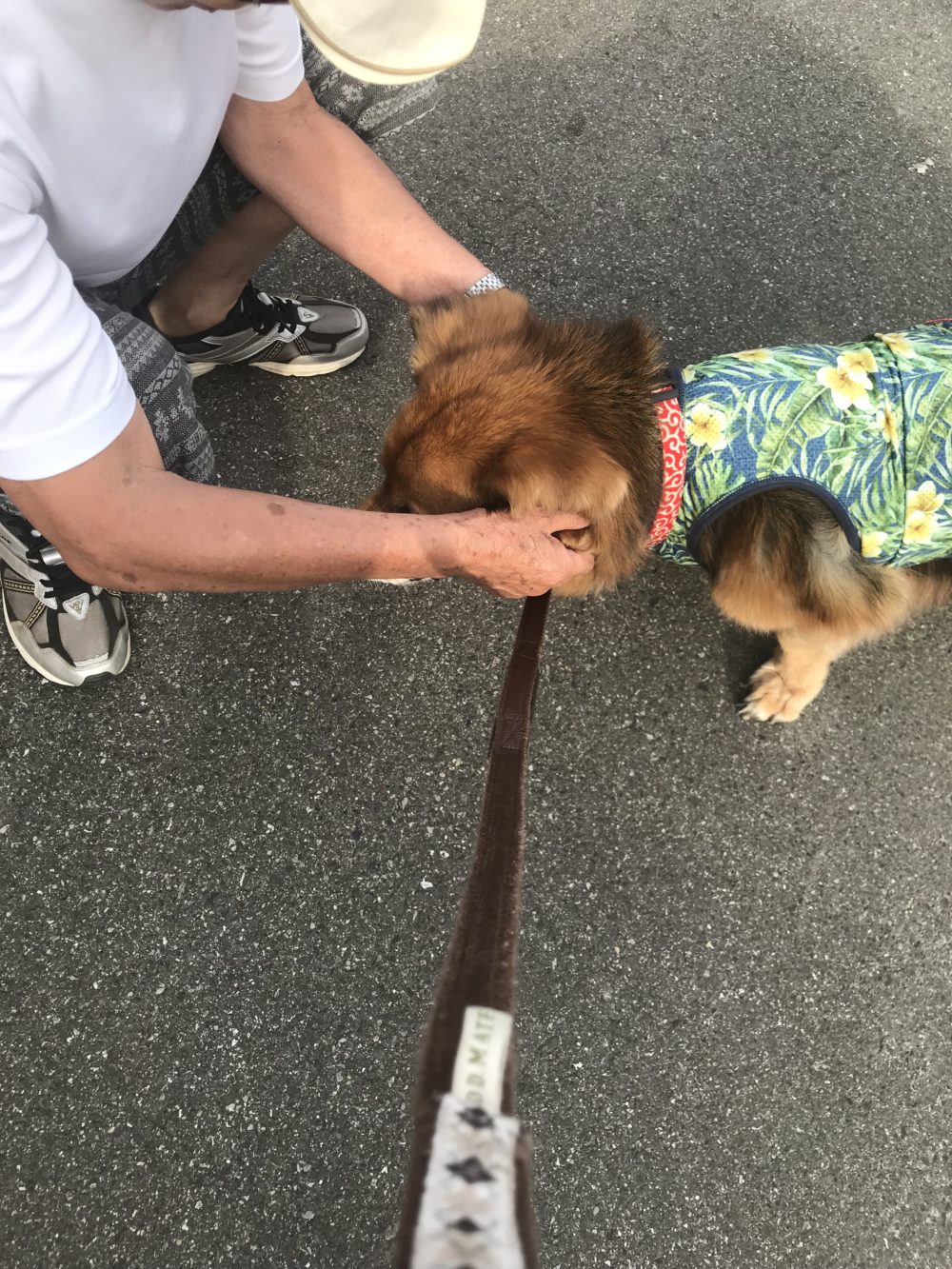 足腰が弱まり日中のお留守番で寂しい思いをされているのではないかとのご家族様のお依頼にてリハビリも兼ねてお散歩してます。散歩後はお家族様の準備された果物や手作りペーストのおやつをペロリと食べてます。夕方日が出ているうちは道路も暑く水撒きながらびくちゃんの足も濡らしながら15〜20分程お散歩してます。