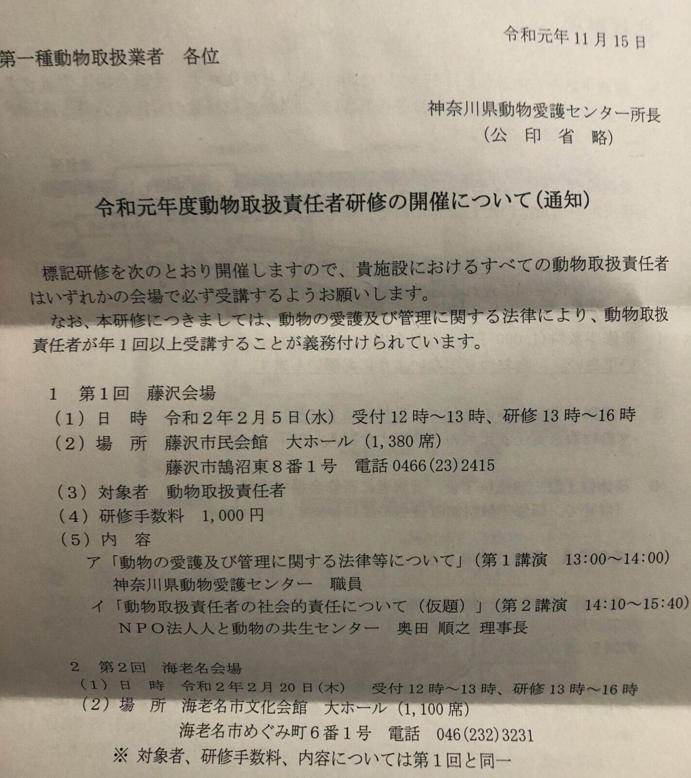 さてそんな中、私は近々、動物取扱責任者の研修へ行くことになっています。