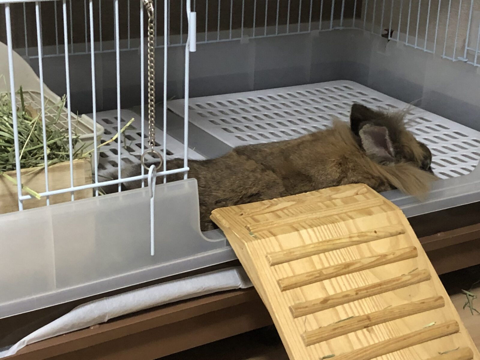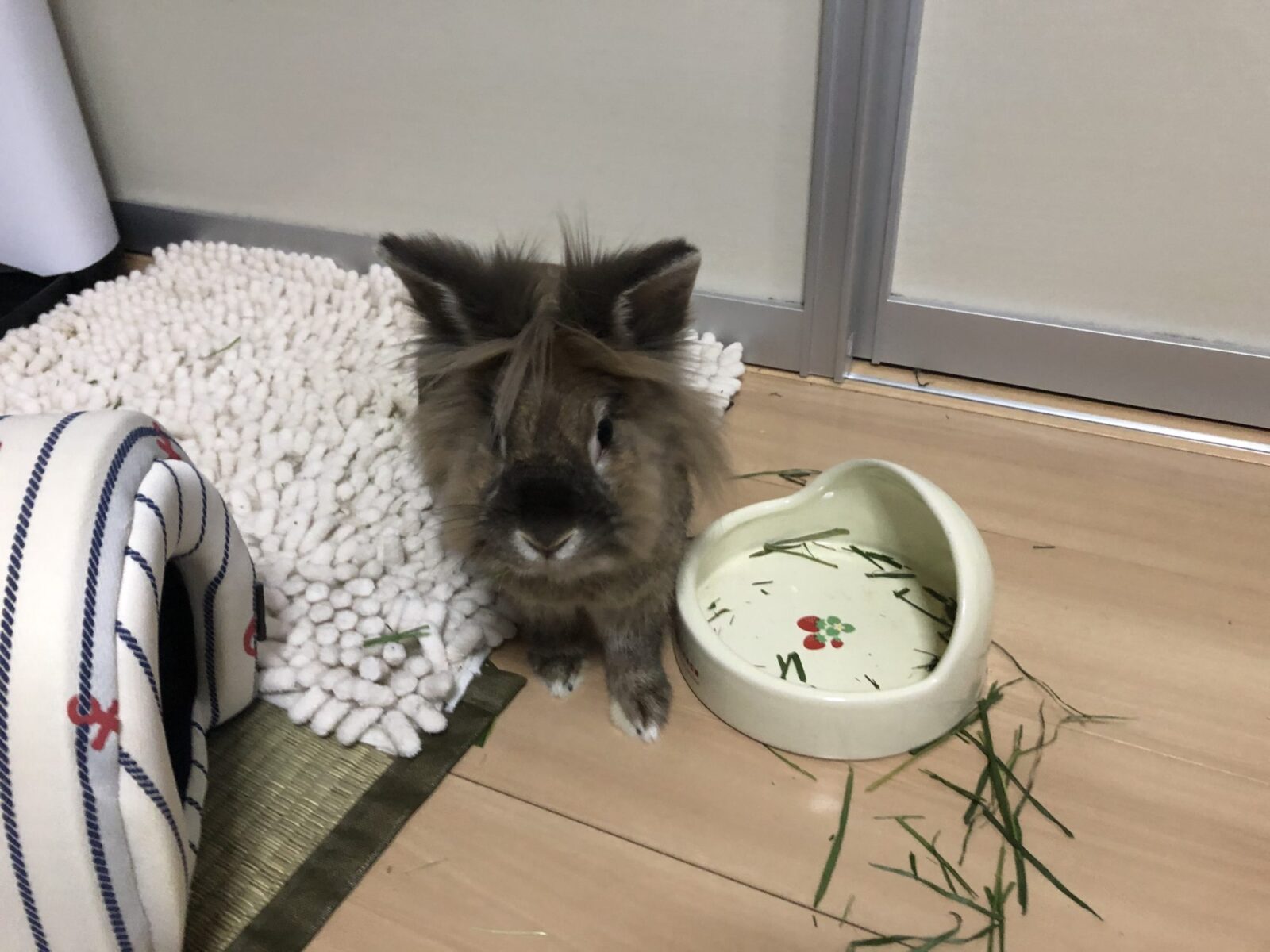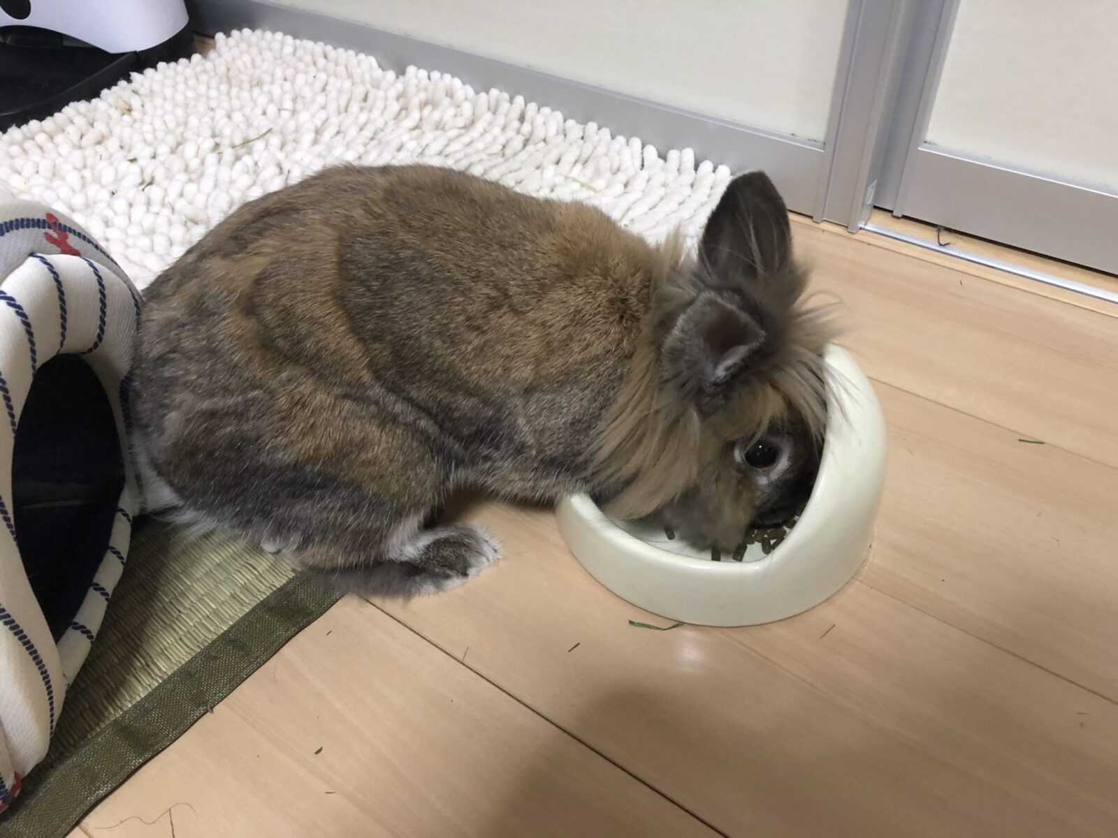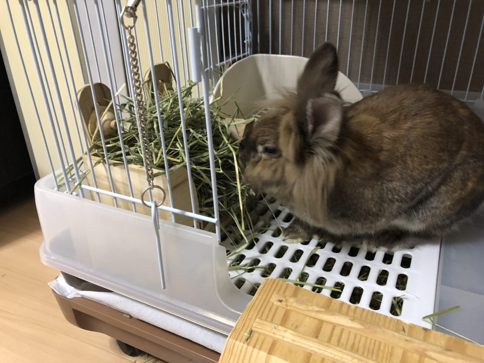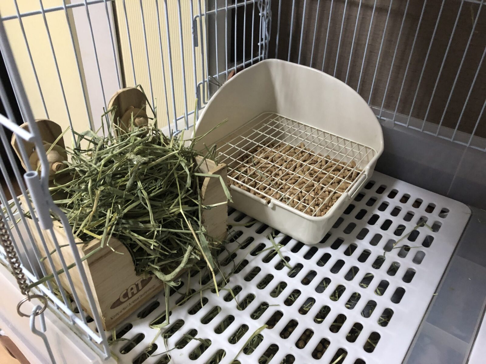 お皿はとっくに空になっており、続けてケージ内の牧草を食べ始めました。