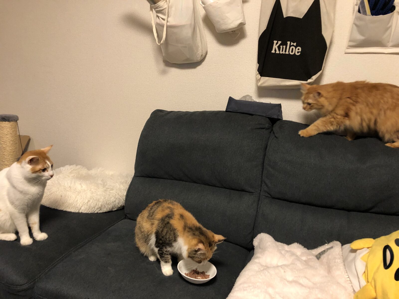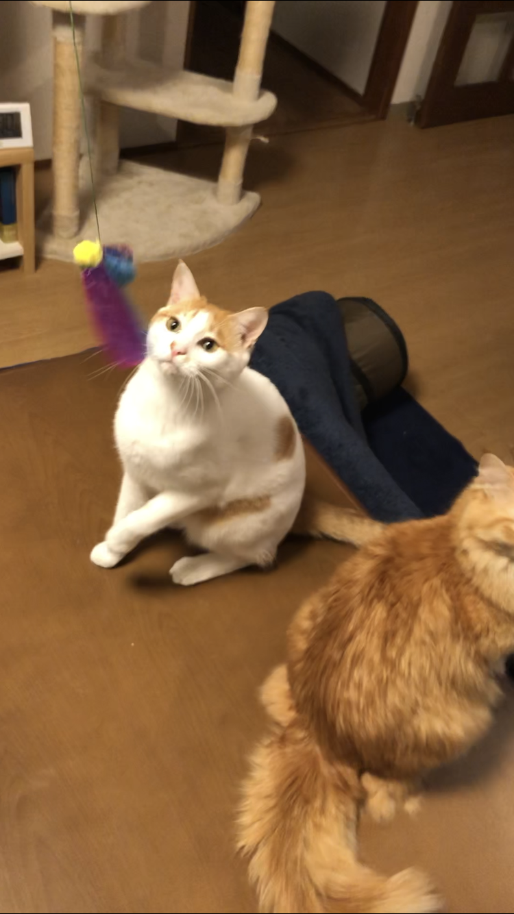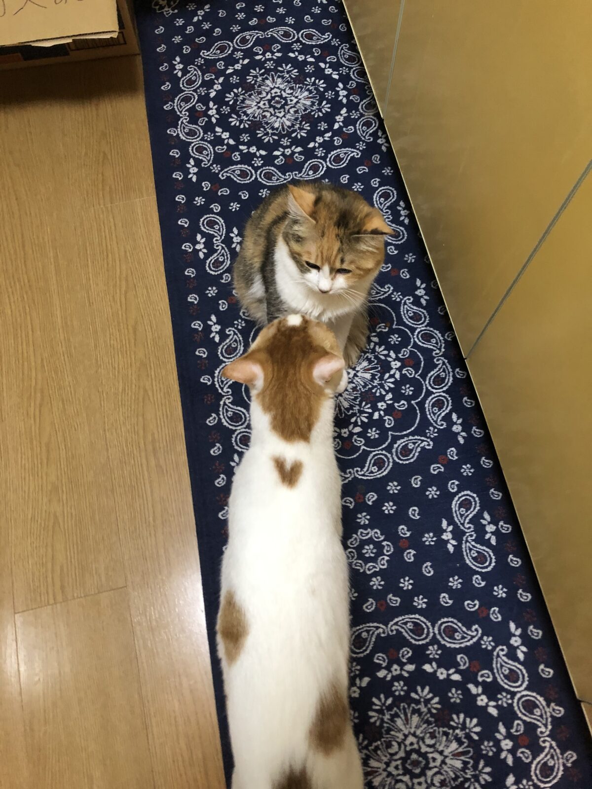 他の猫ちゃんたちの追及から逃げているうちに成り行きで、という感じです。