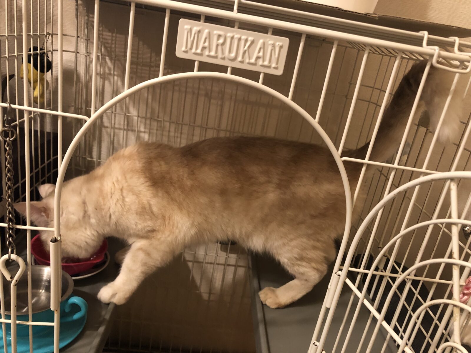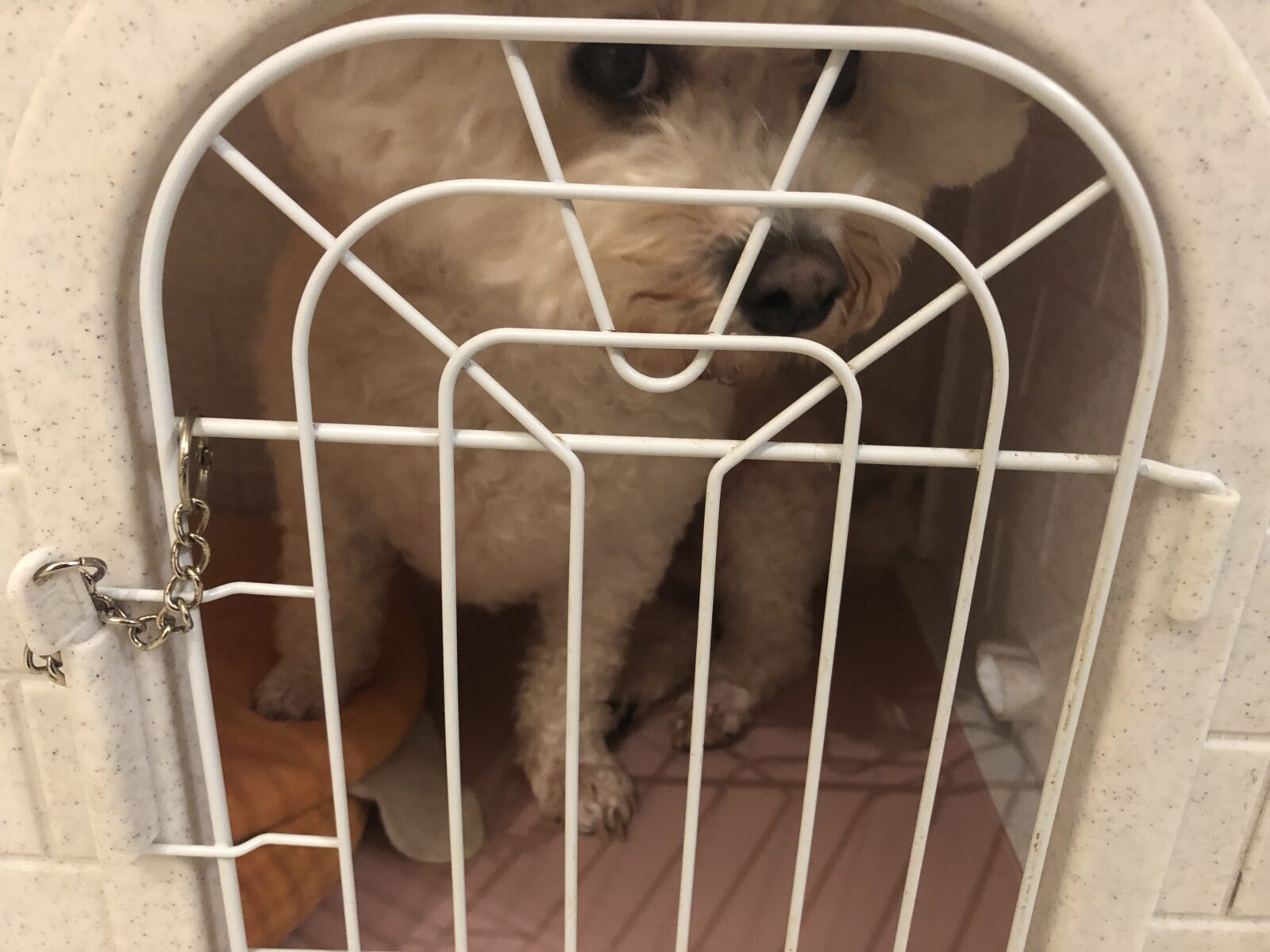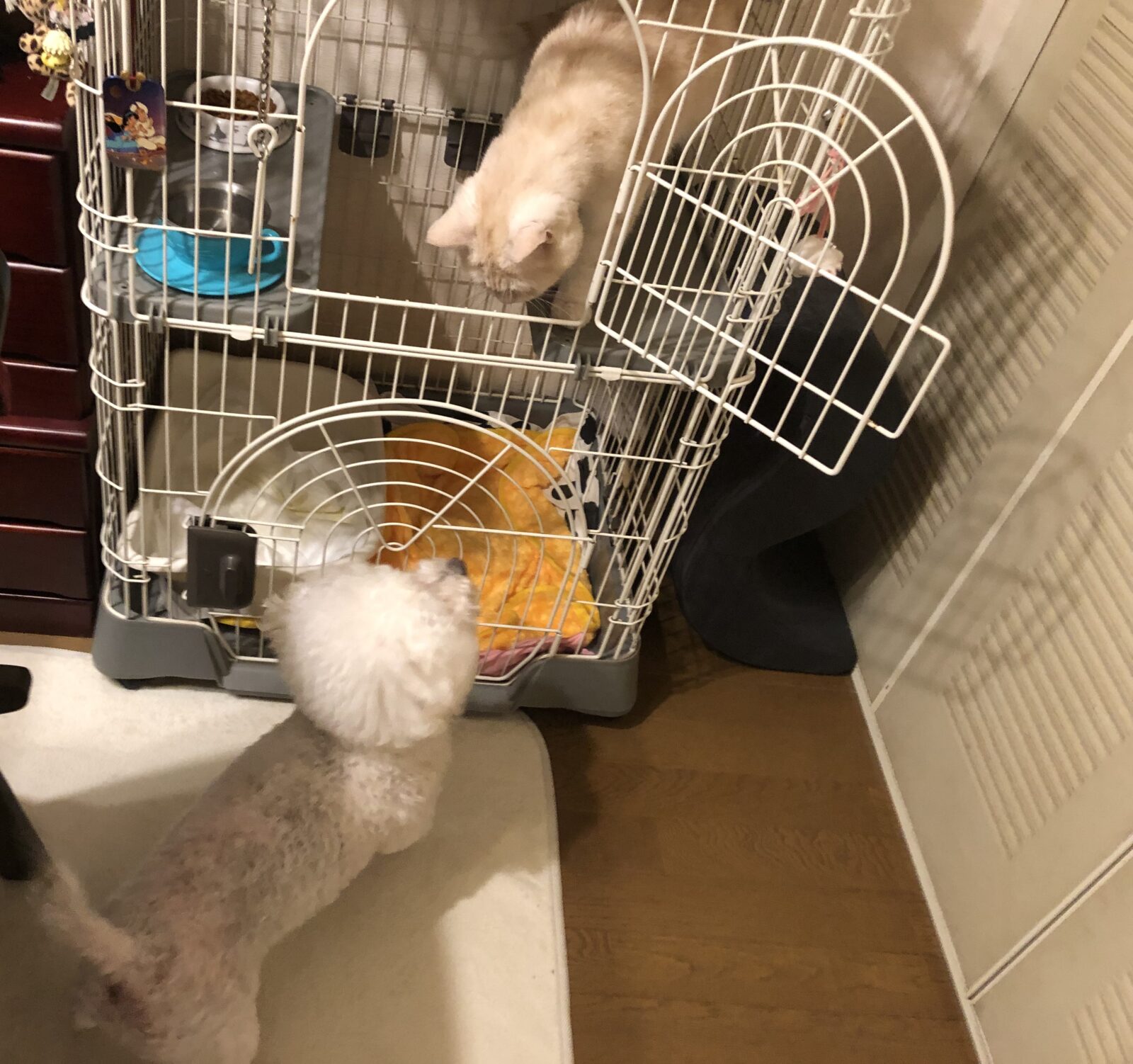 とと丸くんと遊んでいる間、ぽんずちゃんはケージの中で待機。
