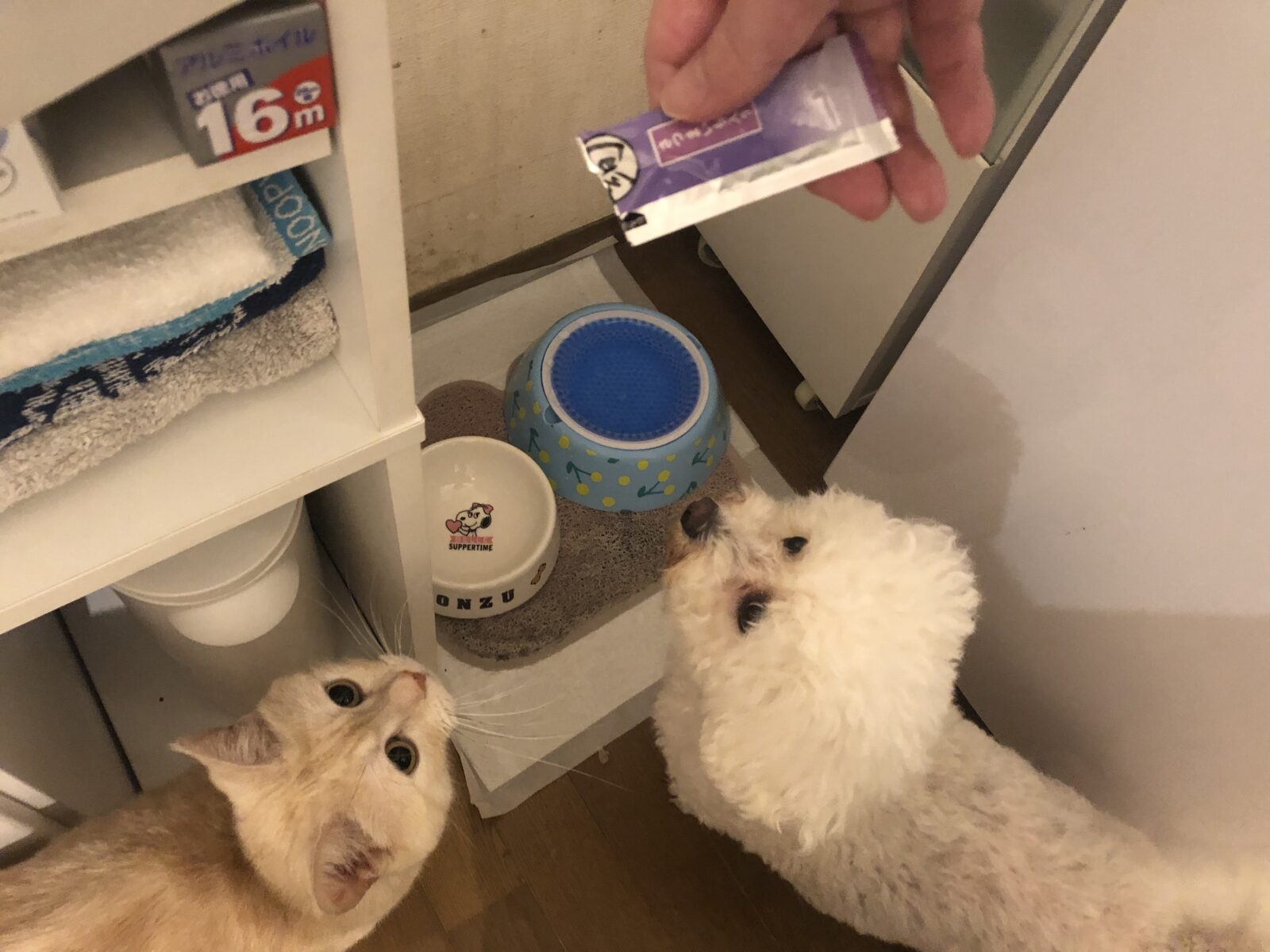 今回はぽんずちゃんにおやつのパウチをあげる際にとと丸くんも寄ってきたりと、